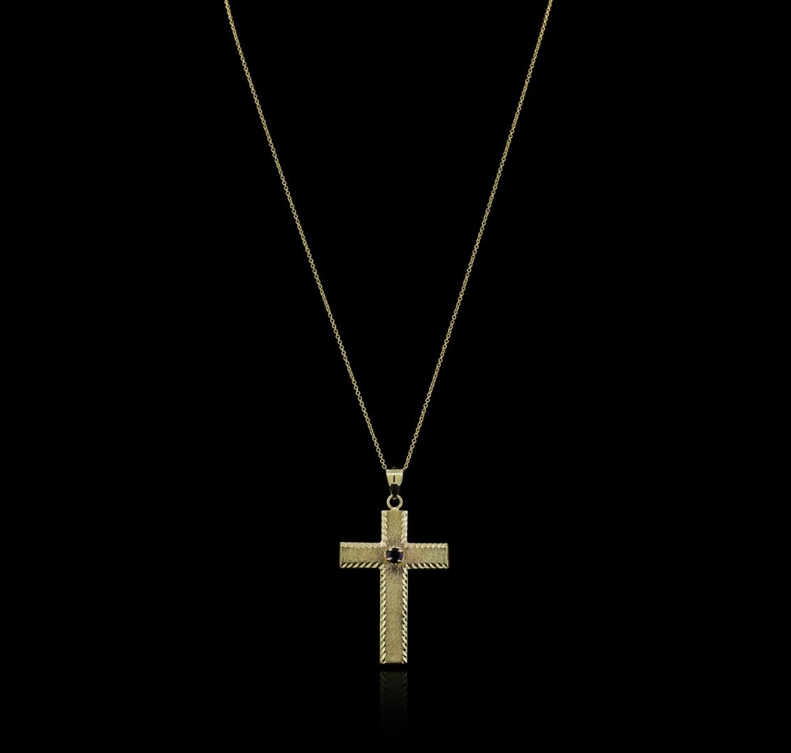One cross pendant with chain featuring: 14KT yellow gold weighing 6.10 grams containing one sapphire with a total weight of 0.25ct.
