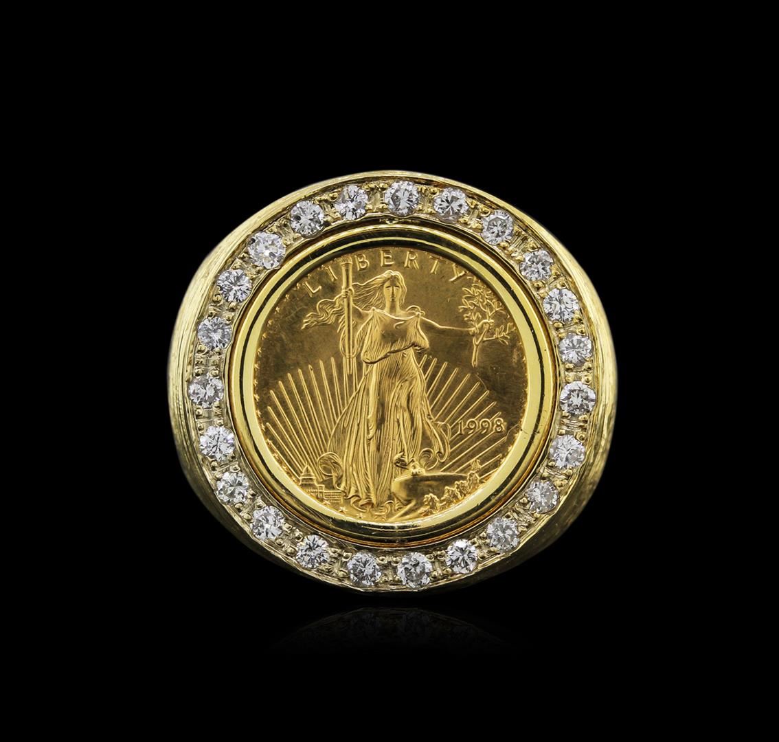 One electronically tested 14KT yellow gold mens cast 1/10oz $5 1998 coin diamond ring with a bright polish finish. Identified with markings of "14K". Condition is new. Containing: Twenty-Four prong set round brilliant cut diamonds, measuring 1.50 - 1.50 x 0.90mm (depth est.) approximate total weight of 24 Stones = 0.30ct. Clarity of SI-1 to SI-2, Color of F - G, Cut is Good. Diamonds are graded in the mounting, unless otherwise stated. Total Weight of Diamonds 0.30ct. Total Weight of Diamond Ring 17.80 grams. GGL Appraised at $3,670.00.