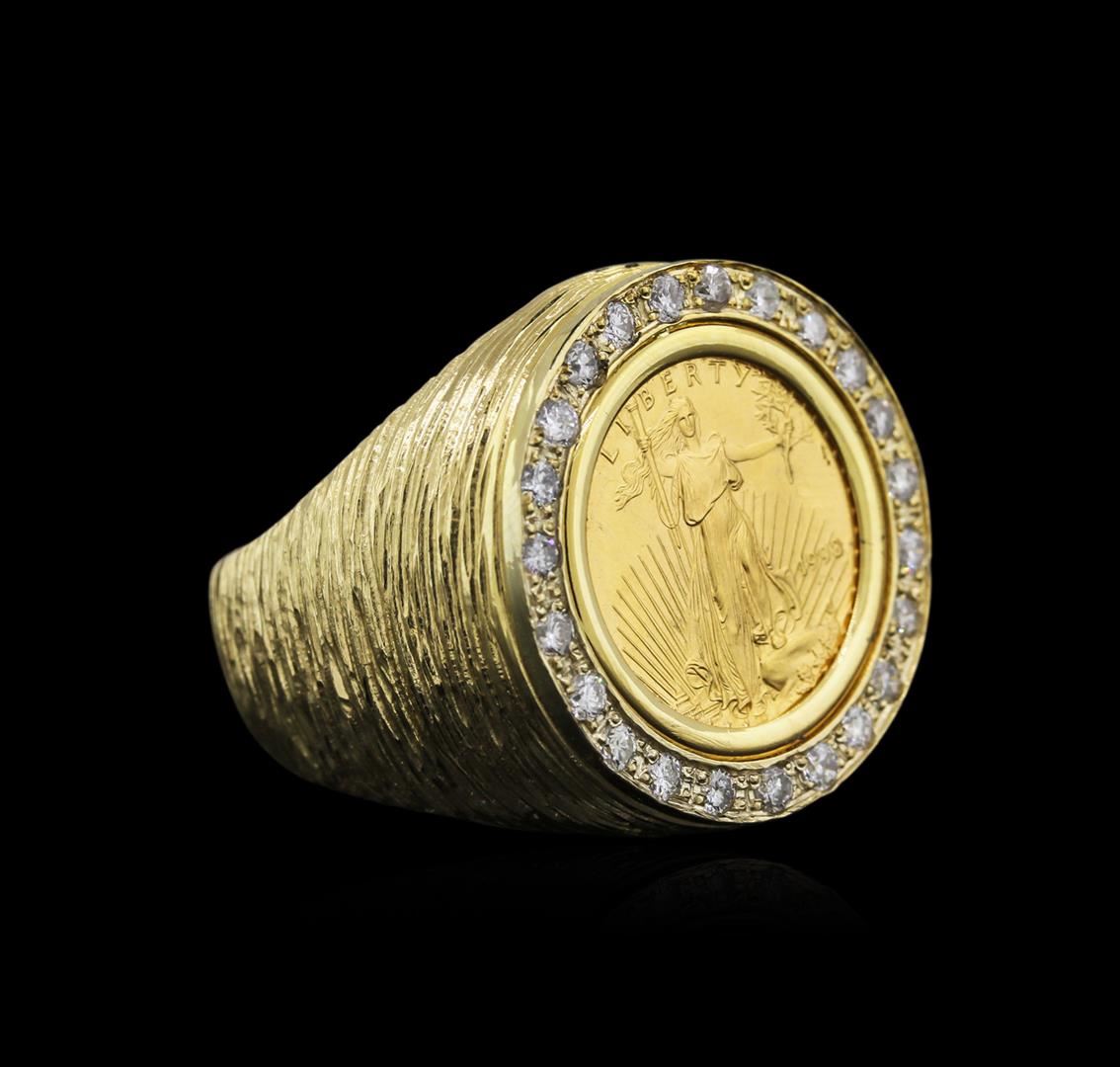 One electronically tested 14KT yellow gold mens cast 1/10oz $5 1998 coin diamond ring with a bright polish finish. Identified with markings of "14K". Condition is new. Containing: Twenty-Four prong set round brilliant cut diamonds, measuring 1.50 - 1.50 x 0.90mm (depth est.) approximate total weight of 24 Stones = 0.30ct. Clarity of SI-1 to SI-2, Color of F - G, Cut is Good. Diamonds are graded in the mounting, unless otherwise stated. Total Weight of Diamonds 0.30ct. Total Weight of Diamond Ring 17.80 grams. GGL Appraised at $3,670.00.