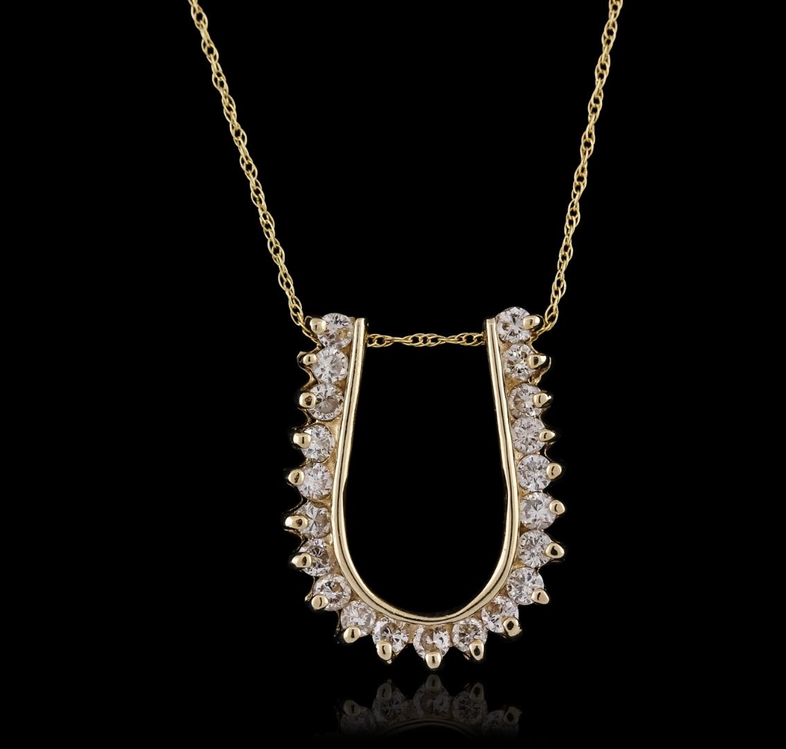 One pendant with chain featuring: 14KT yellow gold with a total weight of 3.53 grams, and diamond with a total weight of 0.30ctw.