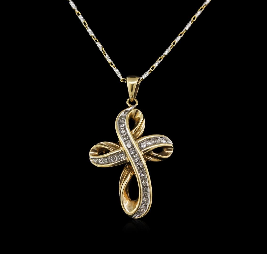 One cross pendant with chain featuring: 14KT yellow gold weighing 6.50 grams containing round diamonds with a total weight of 0.35ct.