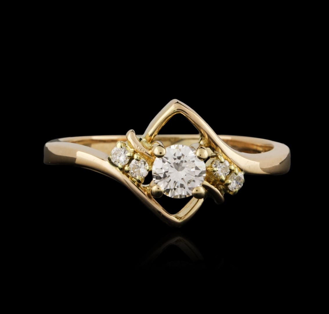 One ring featuring: 14KT yellow gold weighing 3.08 grams containing one prong set round center diamond with a total weight of 0.10ct and prong set round side diamonds with a total weight of 0.25ct.