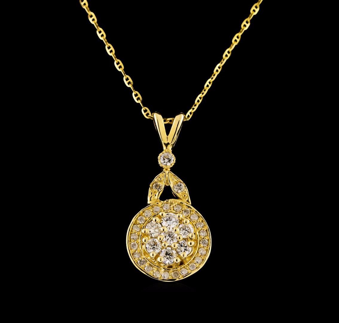 One electronically tested 14KT yellow gold ladies cast diamond pendant & chain 18.0" long, cable link with a spring ring clasp with a bright polish finish. Identified with markings of "14K". Condition is new. Containing: Twenty-Two prong set round brilliant cut diamonds, measuring 1.00 - 1.00 x 0.60mm (depth est.) approximate total weight of 22 Stones = 0.08ct. Clarity: SI-2 to I-1. Color: I - J, Cut is Good. Ten prong set round brilliant cut diamonds, measuring 2.00 - 2.00 x 1.20mm (depth est.) approximate total weight of 10 Stones = 0.29ct. Clarity: SI-1 to SI-2. Color: I - J, Cut is Good. All diamonds are graded in the mounting, unless otherwise stated. Total Weight of Diamonds 0.37ct. Total Weight of Pendant & Chain 3.80 grams. GGL Appraised at $2,320.00.