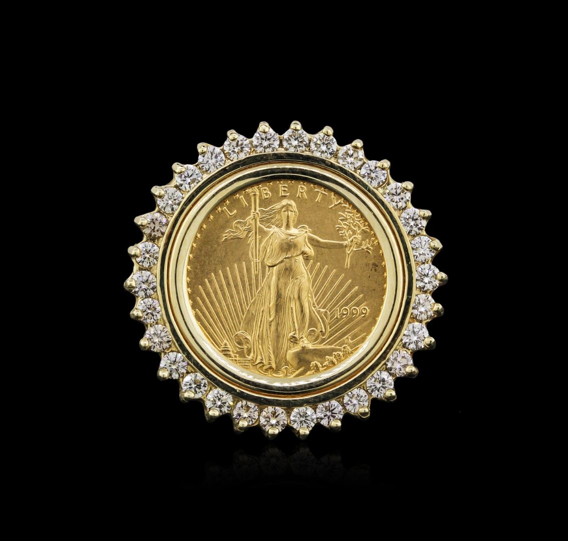 One electronically tested 14KT yellow gold mens cast 1/10oz $5 1999 coin diamond ring with a bright polish finish. Identified with markings of "14K". Condition is new. Containing: Thirty prong set round brilliant cut diamonds, measuring 1.50 - 1.50 x 0.90mm (depth est.) approximate total weight of 30 Stones = 0.37ct. Clarity: SI-1 to I-1. Color: L - M, Cut is Good. Diamonds are graded in the mounting, unless otherwise stated. Total Weight of Diamonds 0.37ct. Total Weight of Diamond Ring 9.00 grams. GGL Appraised at $1,980.00.