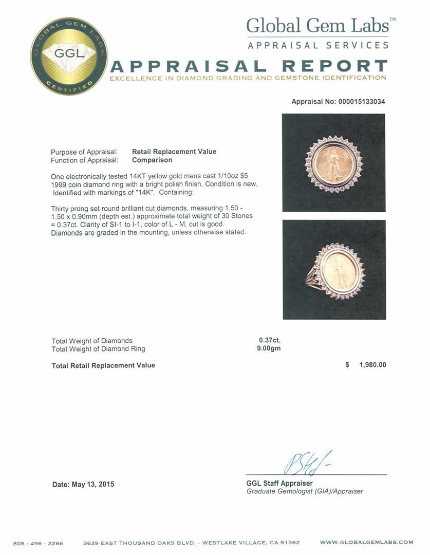 One electronically tested 14KT yellow gold mens cast 1/10oz $5 1999 coin diamond ring with a bright polish finish. Identified with markings of "14K". Condition is new. Containing: Thirty prong set round brilliant cut diamonds, measuring 1.50 - 1.50 x 0.90mm (depth est.) approximate total weight of 30 Stones = 0.37ct. Clarity: SI-1 to I-1. Color: L - M, Cut is Good. Diamonds are graded in the mounting, unless otherwise stated. Total Weight of Diamonds 0.37ct. Total Weight of Diamond Ring 9.00 grams. GGL Appraised at $1,980.00.