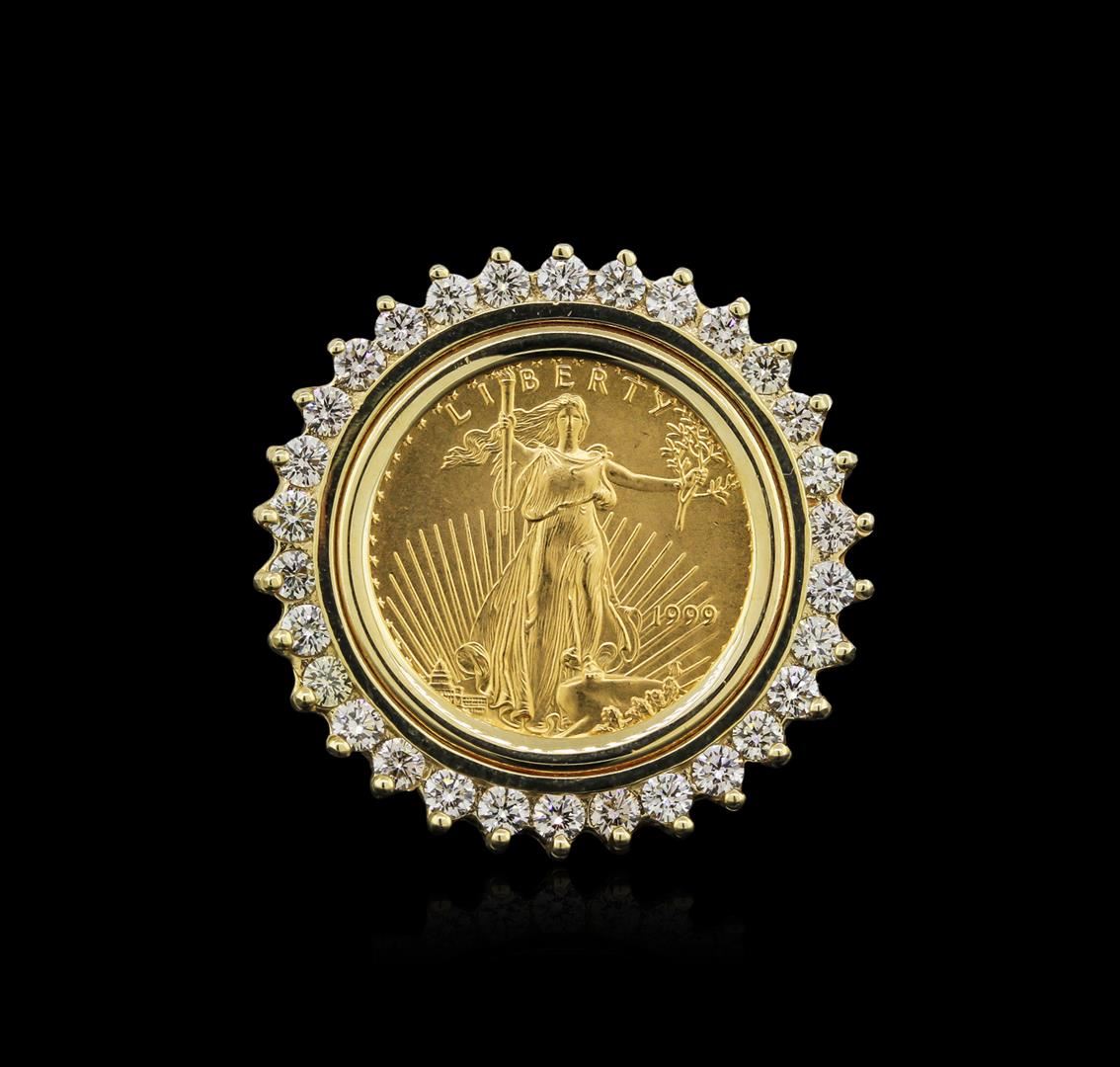 One electronically tested 14KT yellow gold mens cast 1/10oz $5 1999 Liberty Coin diamond ring with a bright polish finish. Identified with markings of "14K". Condition is new. Containing: Thirty prong set round brilliant cut diamonds, measuring 1.50 - 1.50 x 0.90mm (depth est.) approximate total weight of 30 Stones = 0.37ct. Clarity: SI-1 to I-1. Color: L - M, Cut is Good. Diamonds are graded in the mounting, unless otherwise stated. Total Weight of Diamonds 0.37ct. Total Weight of Diamond Ring 9.00 grams. GGL Appraised at $1,980.00.
