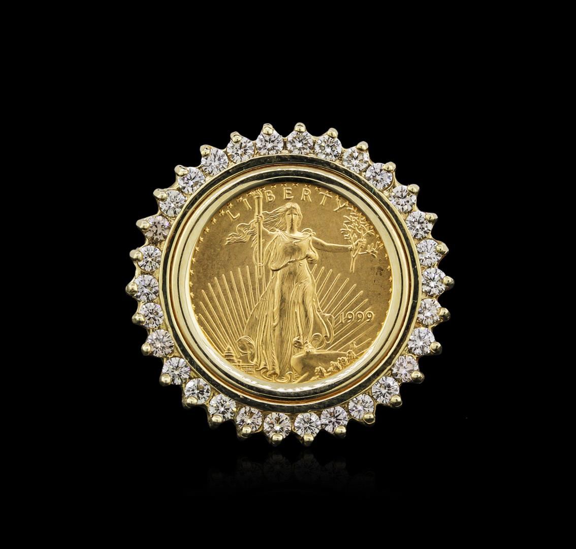 One electronically tested 14KT yellow gold mens cast 1/10oz $5 1999 coin diamond ring with a bright polish finish. Identified with markings of "14K". Condition is new. Containing: Thirty prong set round brilliant cut diamonds, measuring 1.50 - 1.50 x 0.90mm (depth est.) approximate total weight of 30 Stones = 0.37ct. Clarity: SI-1 to I-1. Color: L - M, Cut is Good. Diamonds are graded in the mounting, unless otherwise stated. Total Weight of Diamonds 0.37ct. Total Weight of Diamond Ring 9.00 grams. GGL Appraised at $1,980.00.