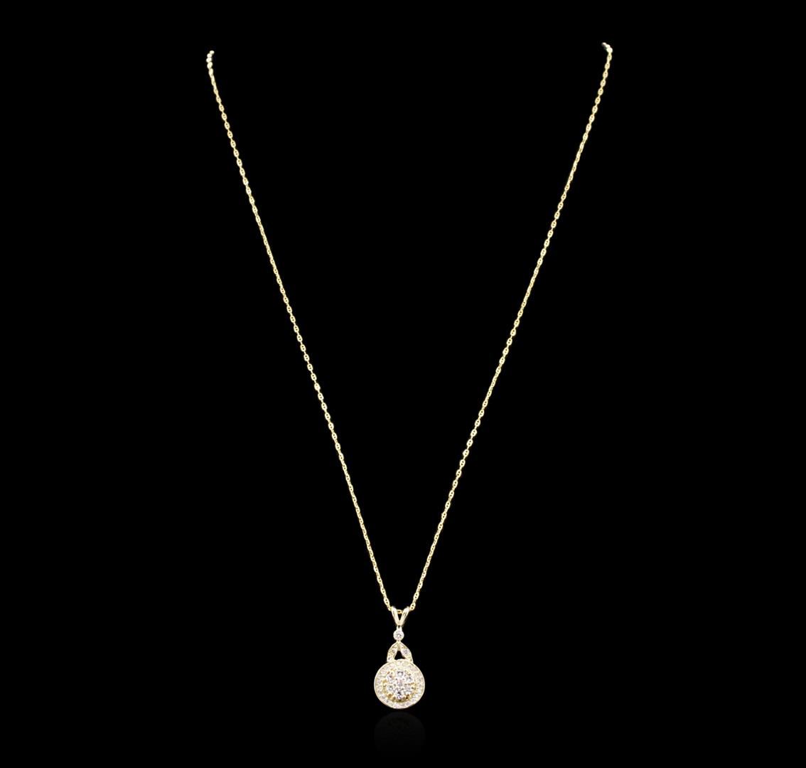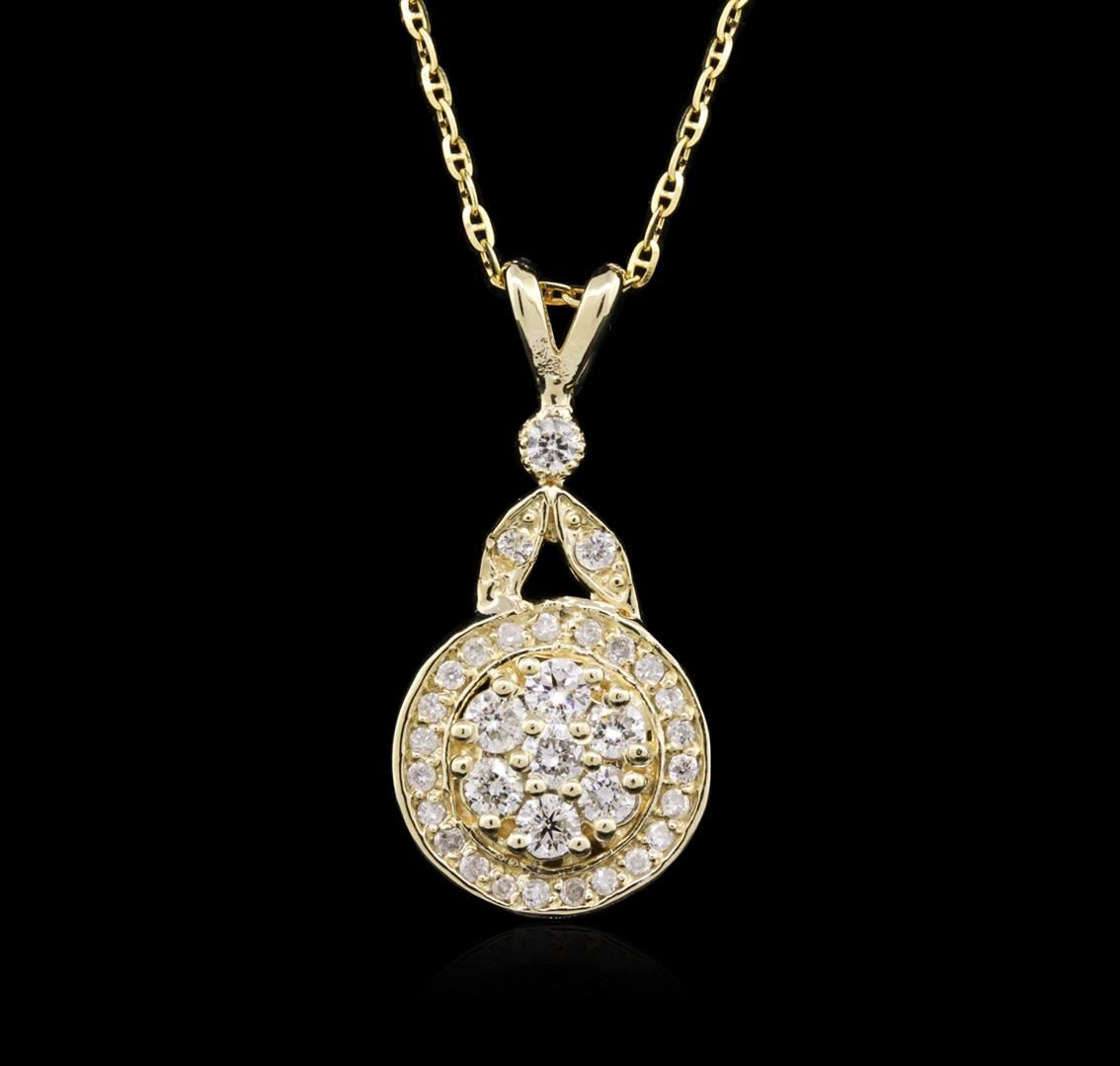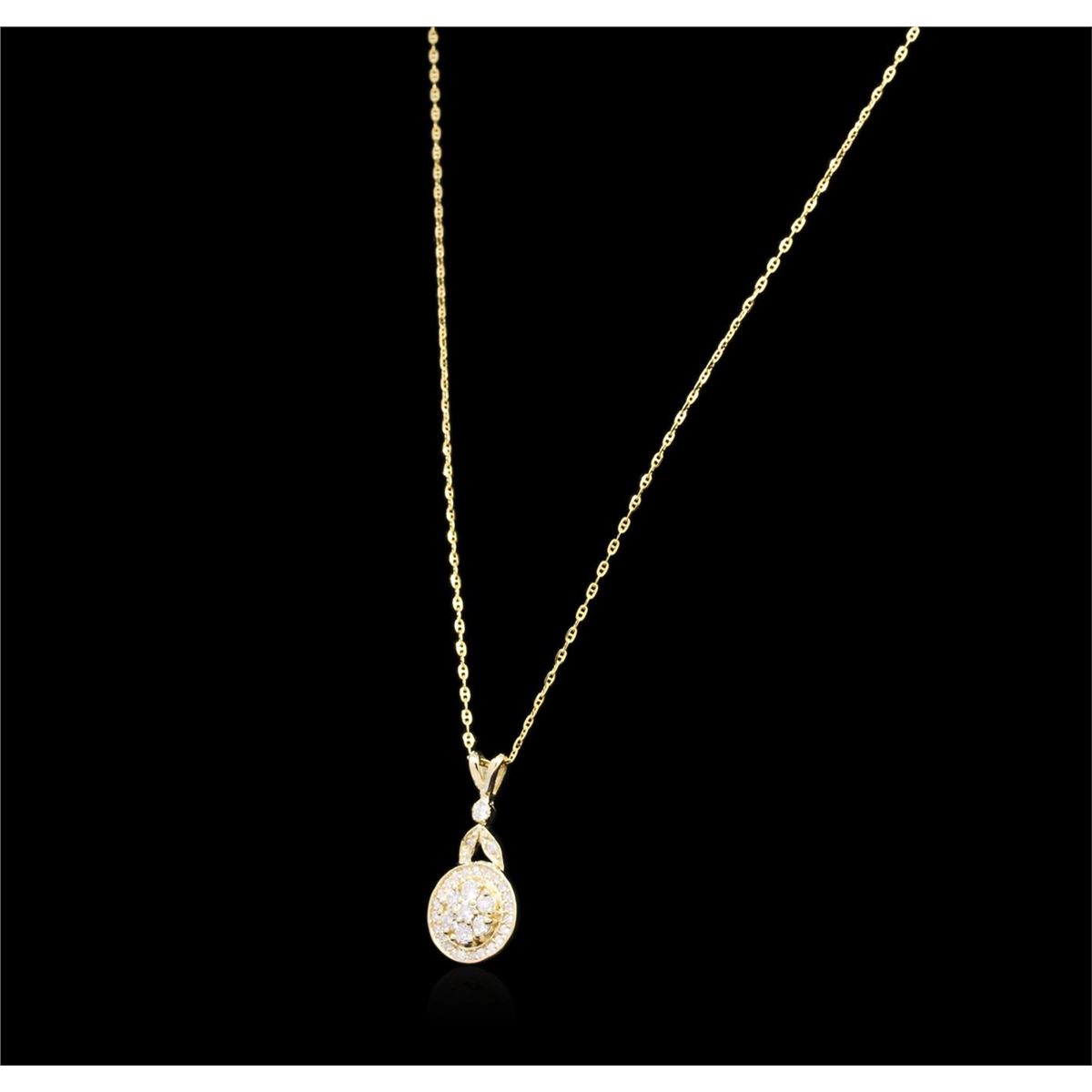 One electronically tested 14KT yellow gold ladies cast diamond pendant & chain 18.0" long, cable link with a spring ring clasp with a bright polish finish. Identified with markings of "14K". Condition is new. Containing: Twenty-Two prong set round brilliant cut diamonds, measuring 1.00 - 1.00 x 0.60mm (depth est.) approximate total weight of 22 Stones = 0.08ct. Clarity: SI-2 to I-1. Color: I - J, Cut is Good. Ten prong set round brilliant cut diamonds, measuring 2.00 - 2.00 x 1.20mm (depth est.) approximate total weight of 10 Stones = 0.29ct. Clarity: SI-1 to SI-2. Color: I - J, Cut is Good. All diamonds are graded in the mounting, unless otherwise stated. Total Weight of Diamonds 0.37ct. Total Weight of Pendant & Chain 3.80 grams. GGL Appraised at $2,320.00.