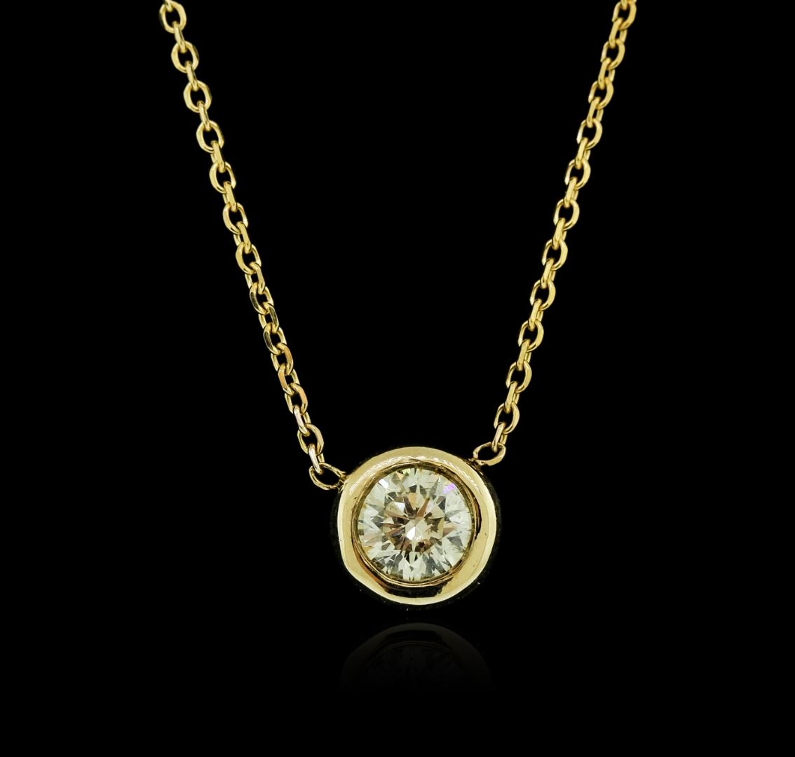 One solitaire necklace featuring: 14KT yellow gold weighing 2.10 grams containing one bezel set round diamond with a total weight of 0.38ct.