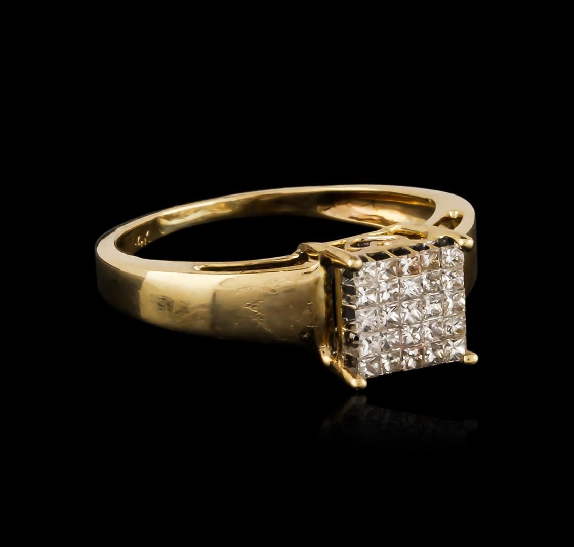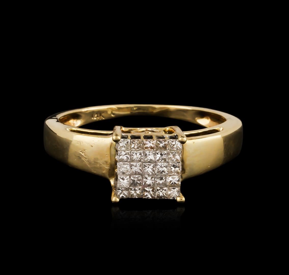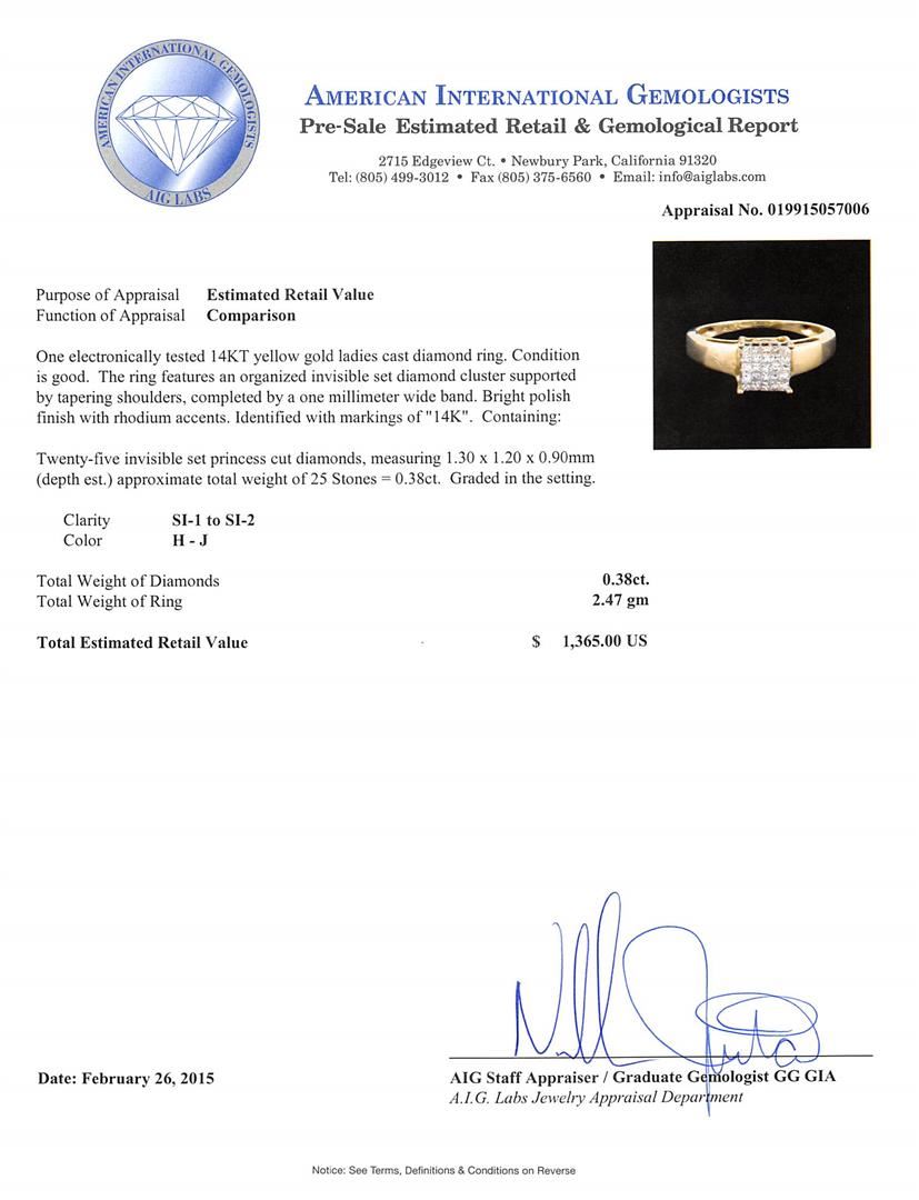 One electronically tested 14KT yellow gold ladies cast diamond ring. The ring features an organized invisible set diamond cluster supported by tapering shoulders, completed by a one millimeter wide band. Bright polish finish with rhodium accents. Identified with markings of "14K". Condition is good. Containing: Twenty-Five invisible set princess cut diamonds, measuring 1.30 x 1.20 x 0.90mm (depth est.) approximate total weight of 25 Stones = 0.38ct. Graded in the setting. Clarity: SI-1 to SI-2. Color: H - J. Total Weight of Diamonds 0.38ct. Total Weight of Ring 2.47 grams. AIG Appraised at $1,365.00.