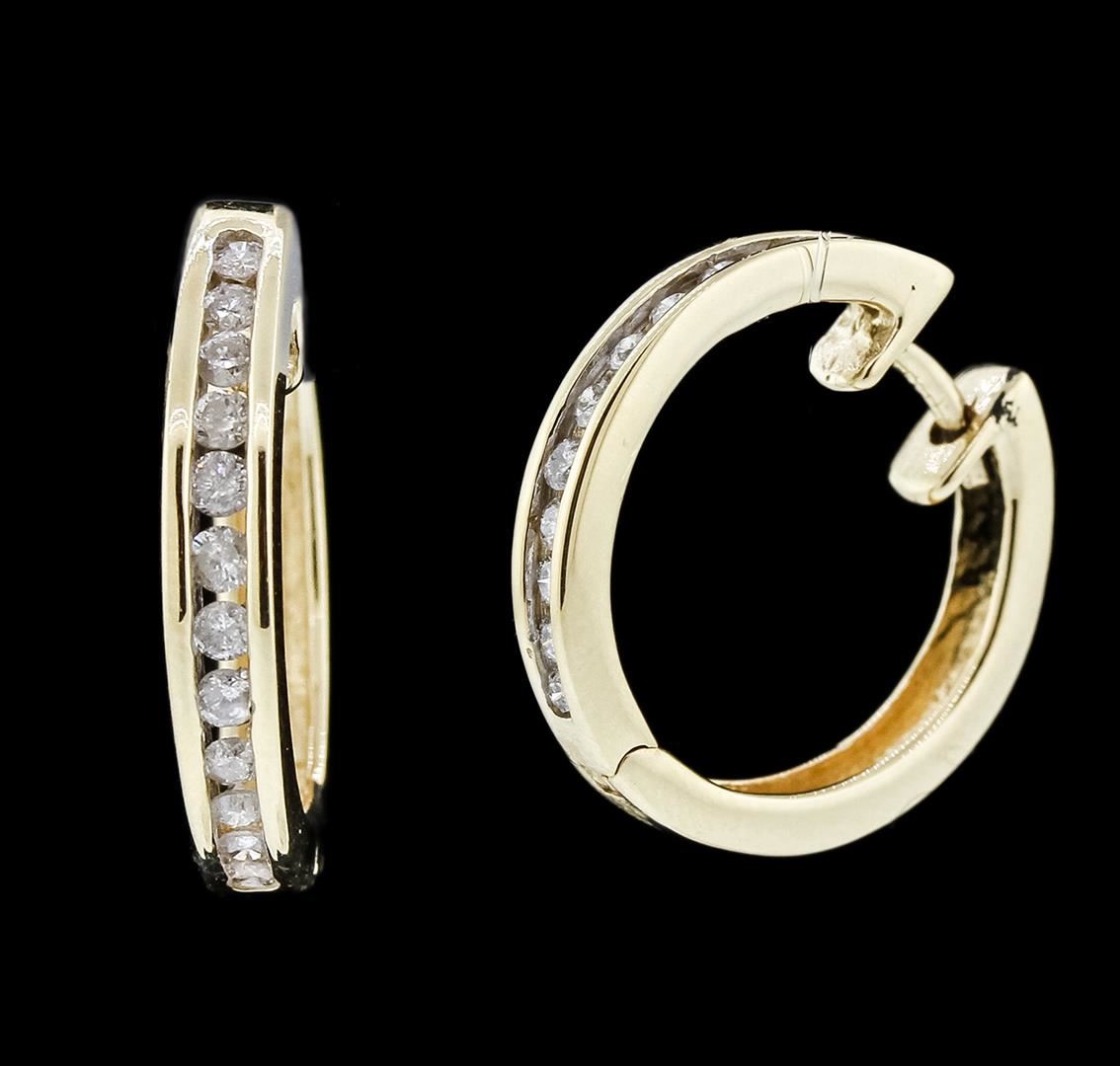 One pair of hoop earrings featuring: 14KT yellow gold weighing 5.40 grams containing diamonds with a total weight of 0.39ct.