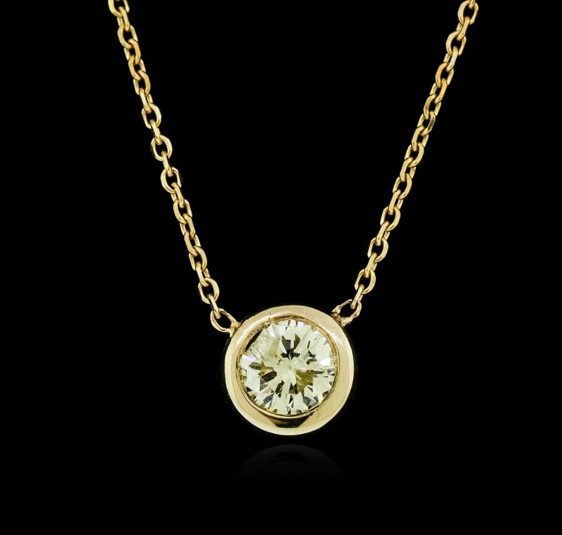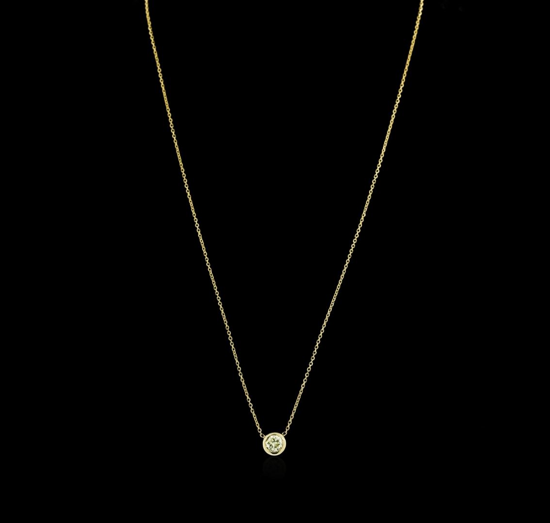 One solitaire necklace featuring: 14KT yellow gold weighing 2.10 grams containing one bezel set round diamond with a total weight of 0.42ct.