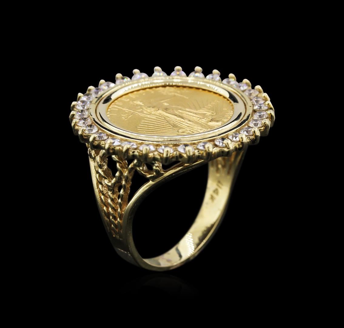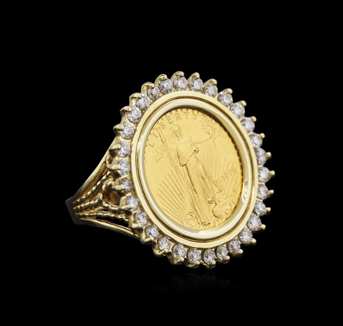 One electronically tested 14KT yellow gold mens cast 1/10oz $5 Liberty Coin 1999 diamond ring with a bright polish finish. Identified with markings of "14K". Condition is new. Containing: Thirty prong set round brilliant cut diamonds, measuring 1.60 - 1.60 x 0.96mm (depth est.) approximate total weight of 30 Stones = 0.45ct. Clarity: SI-2 to I-1. Color: J - K, Cut is Good. Diamonds are graded in the mounting, unless otherwise stated. Total Weight of Diamonds 0.45ct. Total Weight of Diamond Ring 8.40 grams. GGL Appraised at $2,665.00.