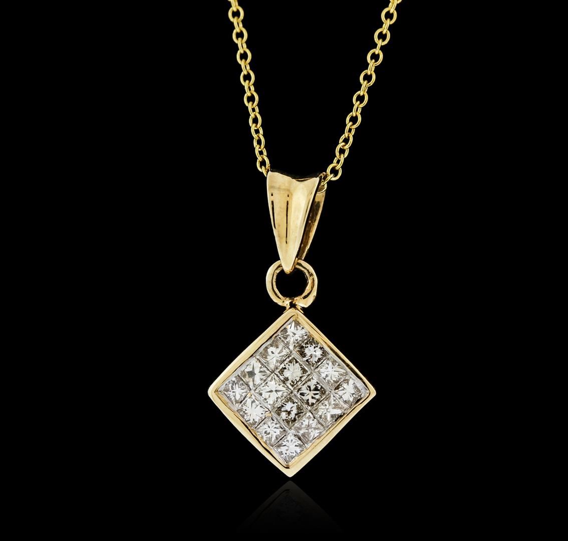 One pendant with chain featuring: 14KT yellow gold weighing 2.70 grams containing invisible set princess cut diamonds with a total weight of 0.50ct.