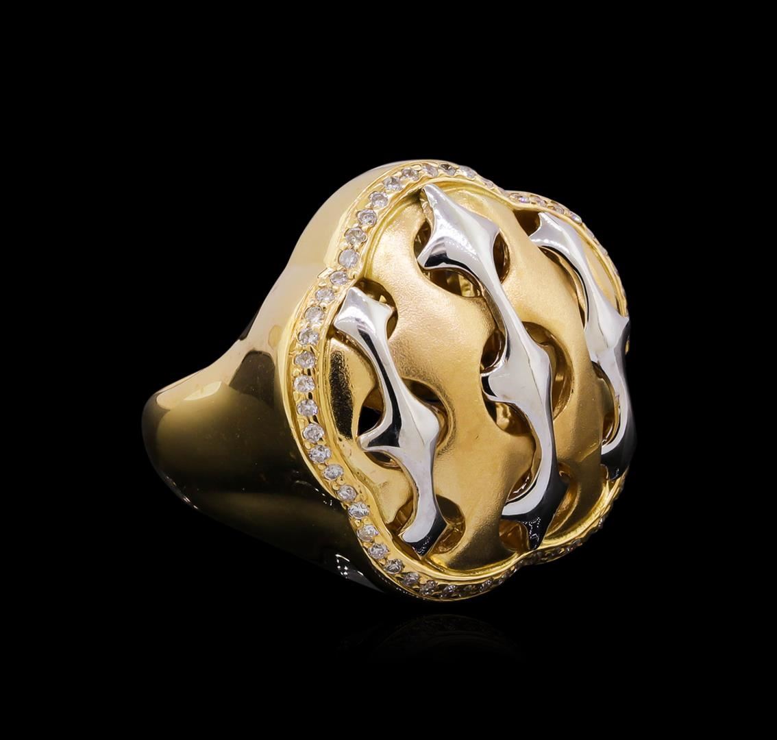 One electronically tested 14KT yellow gold Ladies die struck & assembled fancy ring with a bright polish finish. Identified with markings of "14K". Condition is excellent. Containing: Fifty-Four bead set round brilliant cut diamonds, measuring 1.20 - 1.20 x 0.72mm (depth est.) approximate total weight of 54 Stones = 0.50ct. Clarity of I-1 to I-2, Color of H - I. Total Weight of Diamonds 0.50ct. Total Weight of Rin 18.50gm. GGL Appraised at $4,846.00.
