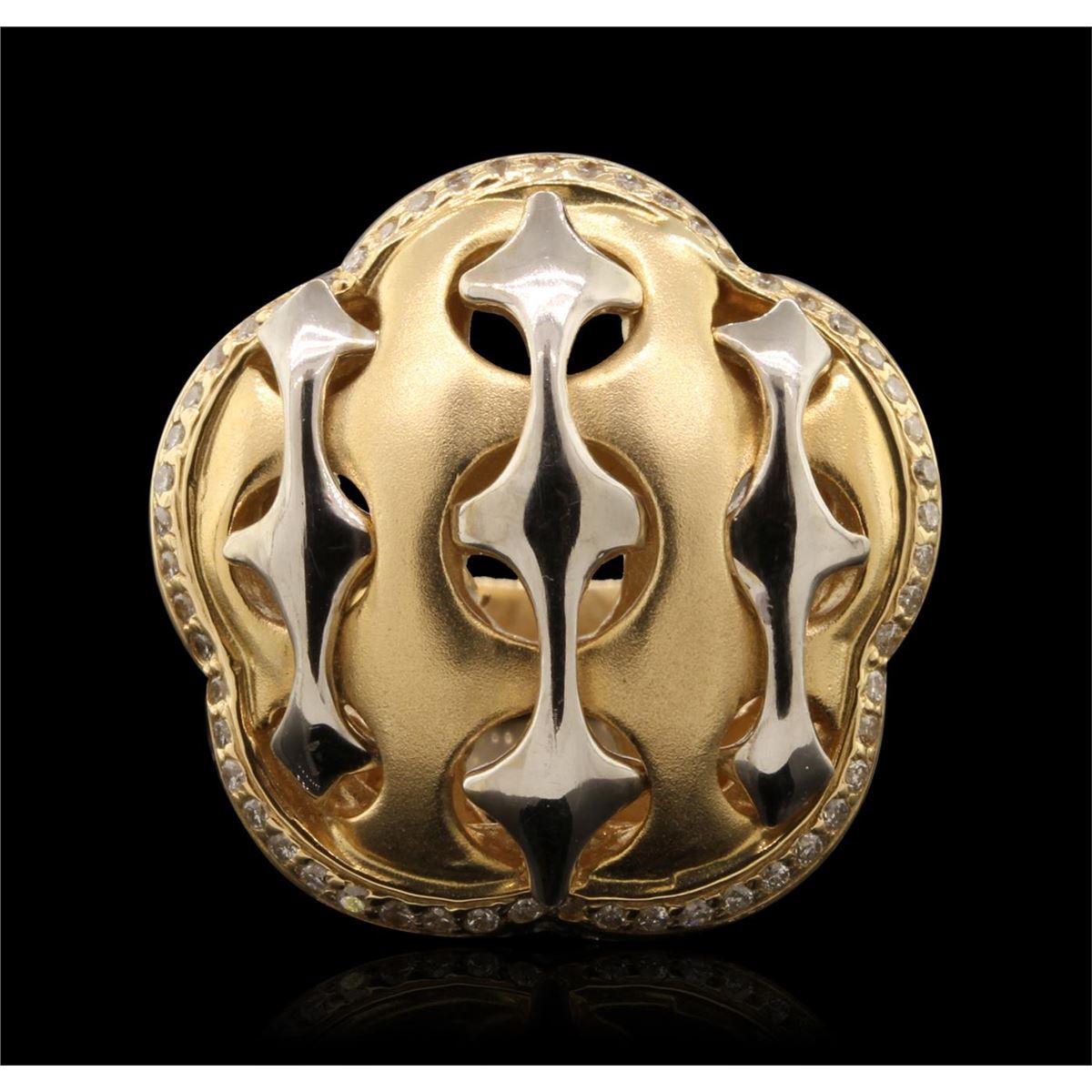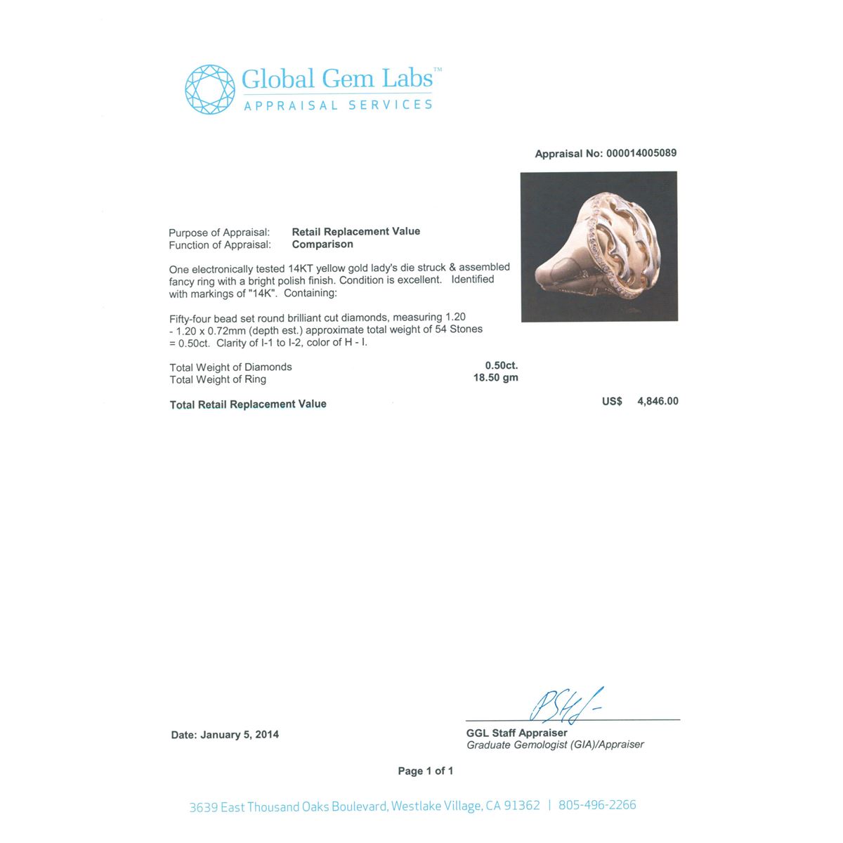 One electronically tested 14KT yellow gold Ladies die struck & assembled fancy ring with a bright polish finish. Identified with markings of "14K". Condition is excellent. Containing: Fifty-Four bead set round brilliant cut diamonds, measuring 1.20 - 1.20 x 0.72mm (depth est.) approximate total weight of 54 Stones = 0.50ct. Clarity of I-1 to I-2, Color of H - I. Total Weight of Diamonds 0.50ct. Total Weight of Ring 18.50gm. GGL Appraised at $4,846.00.
