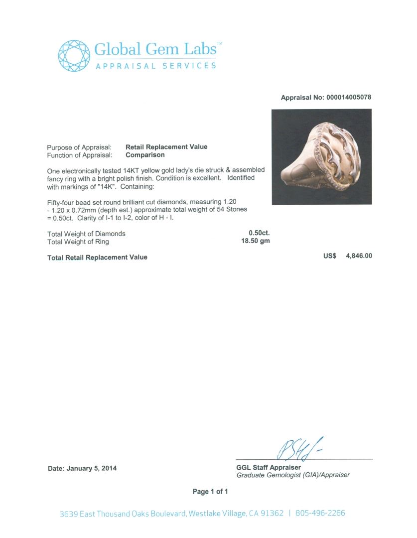 One electronically tested 14KT yellow gold Ladies die struck & assembled fancy ring with a bright polish finish. Identified with markings of "14K". Condition is excellent. Containing: Fifty-Four bead set round brilliant cut diamonds, measuring 1.20 - 1.20 x 0.72mm (depth est.) approximate total weight of 54 Stones = 0.50ct. Clarity of I-1 to I-2, Color of H - I. Total Weight of Diamonds 0.50ct. Total Weight of Rin 18.50gm. GGL Appraised at $4,846.00.