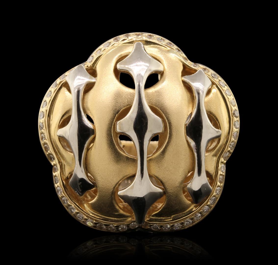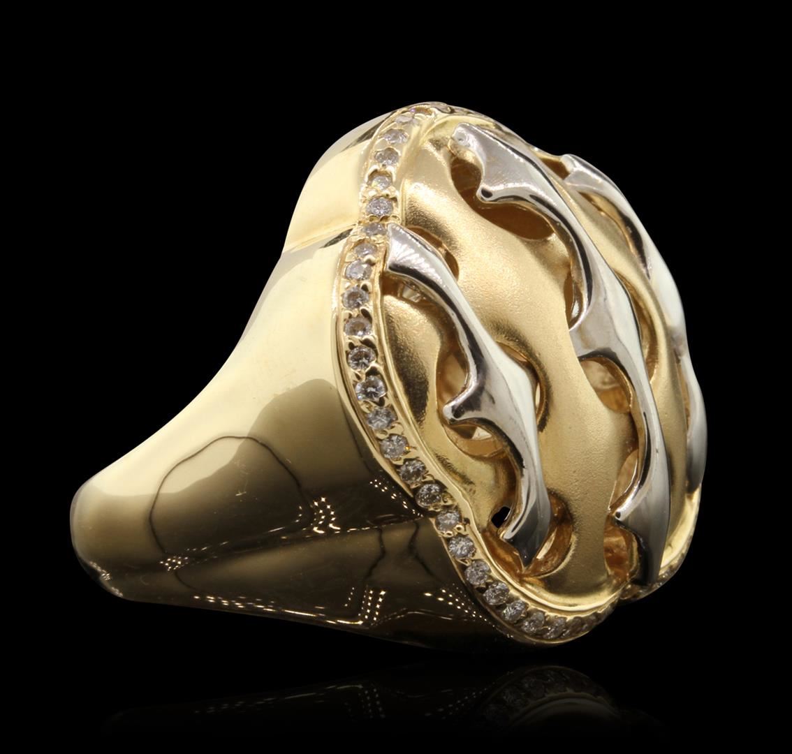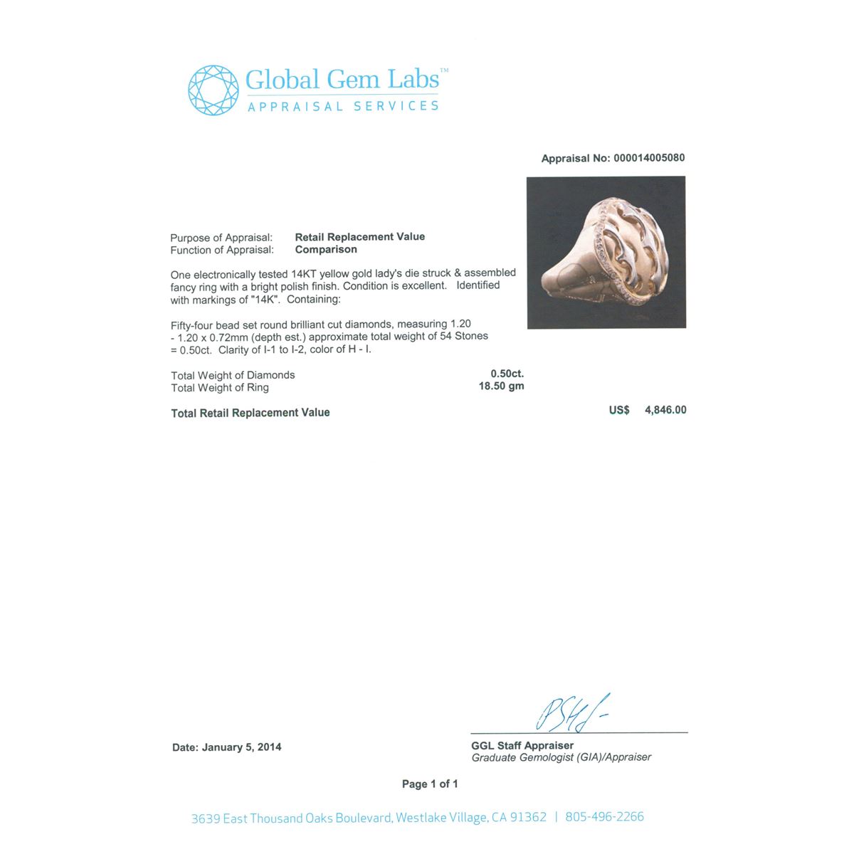 One electronically tested 14KT yellow gold Ladies die struck & assembled fancy ring with a bright polish finish. Identified with markings of "14K". Condition is excellent. Containing: Fifty-Four bead set round brilliant cut diamonds, measuring 1.20 - 1.20 x 0.72mm (depth est.) approximate total weight of 54 Stones = 0.50ct. Clarity of I-1 to I-2, Color of H - I. Total Weight of Diamonds 0.50ct. Total Weight of Rin 18.50gm. GGL Appraised at $4,846.00.