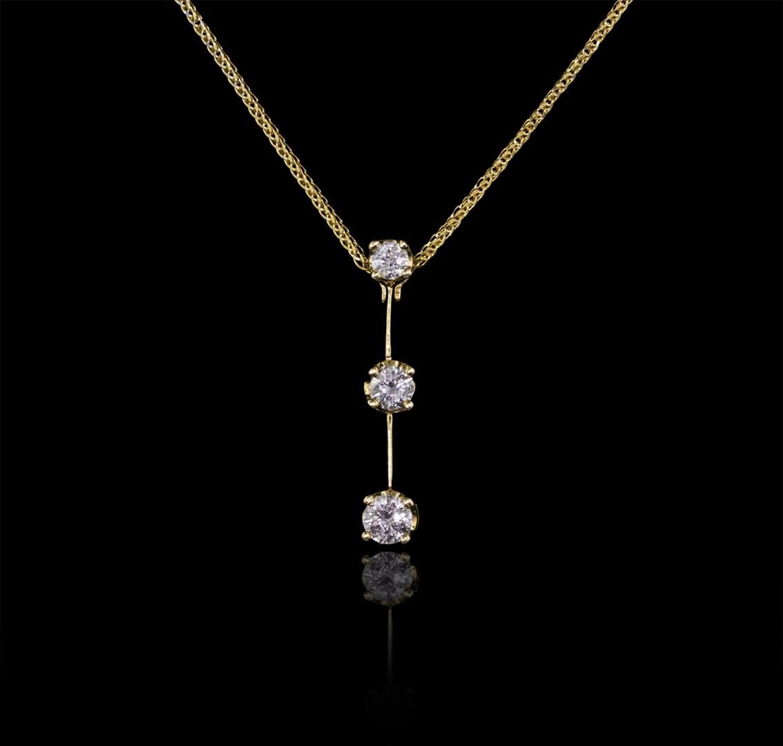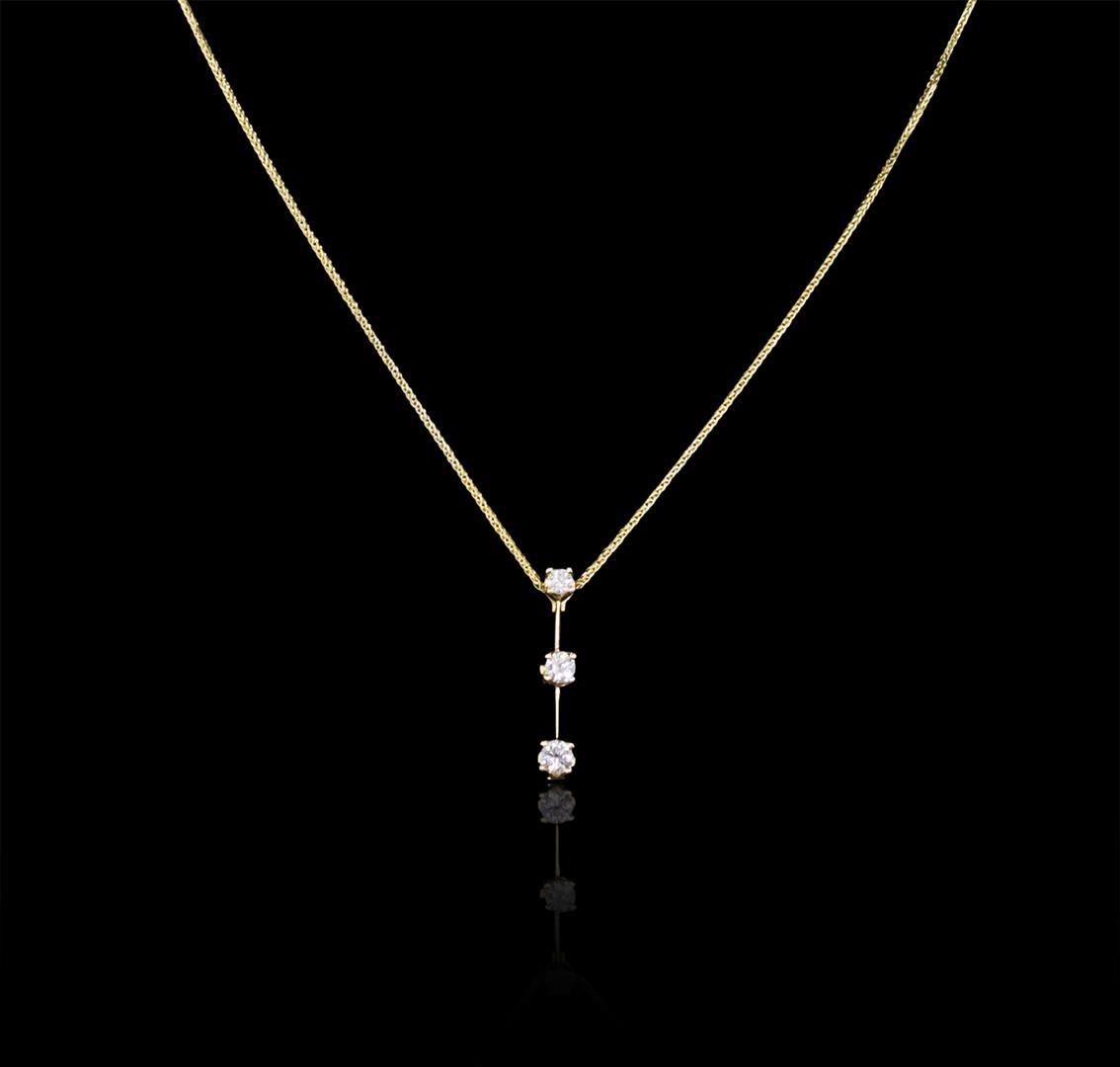 One electronically tested 14KT yellow gold ladies cast & assembled three diamond pendant with chain. The pendant is supported by an eighteen inch length 14KT yellow gold designer style chain, terminating in a lobster claw clasp. Bright polish finish. Trademark is KEEPSAKE. Identified with markings of "14K". Condition is new, good workmanship. Containing: One prong set round brilliant cut diamond, measuring 2.80 - 2.79 x 1.60mm (depth est.) approximate weight of 0.10ct. Graded in the setting. Clarity: I-1. Color: G. Depth 57.1%. Table 64.6%. One prong set round brilliant cut diamond, measuring 3.40 - 3.35 x 2.05mm (depth est.) approximate weight of 0.20ct. Graded in the setting. Clarity: I-1. Color: 60.7%. Table 65.1%. One prong set round brilliant cut diamond, measuring 3.65 - 3.60 x 2.30mm (depth est.) approximate weight of 0.25ct with a faint blue fluorescence. Graded in the setting. Clarity: SI-2. Color: 63.4%. Table 66.1%. Total Weight of Diamonds 0.55ct. Total Weight of Pendant With Chain 2.93 grams. AIG Appraised at $2,415.00.