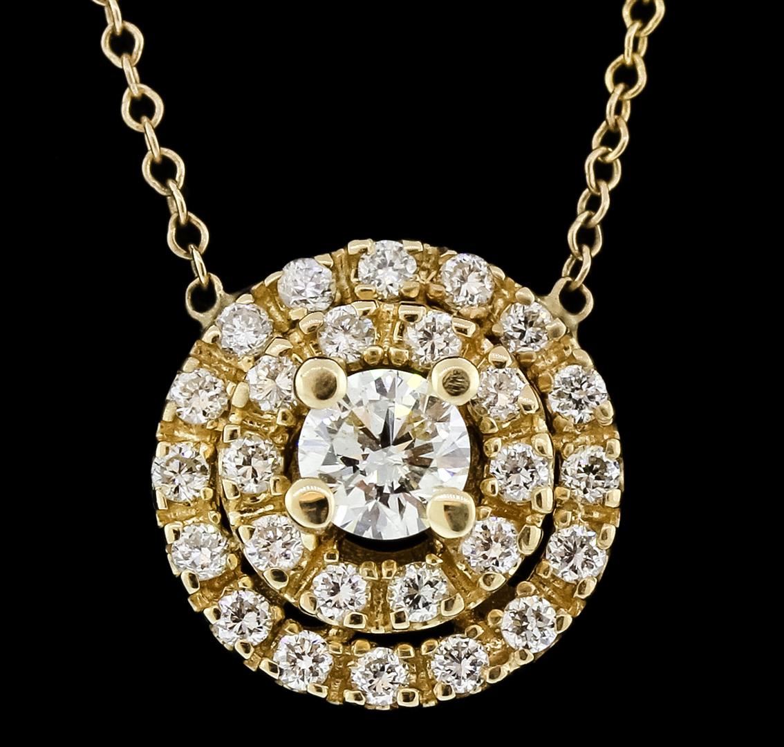 One pendant with chain featuring: 14KT yellow gold weighing 3.30 grams containing one center diamond with a total weight of 0.30ct and side diamonds with a total weight of 0.25ct.
