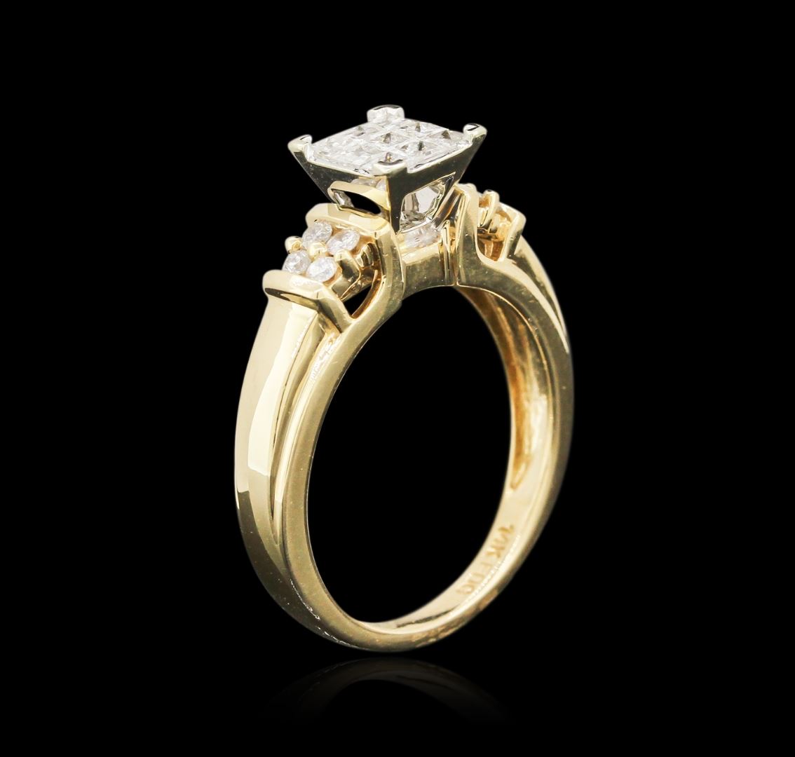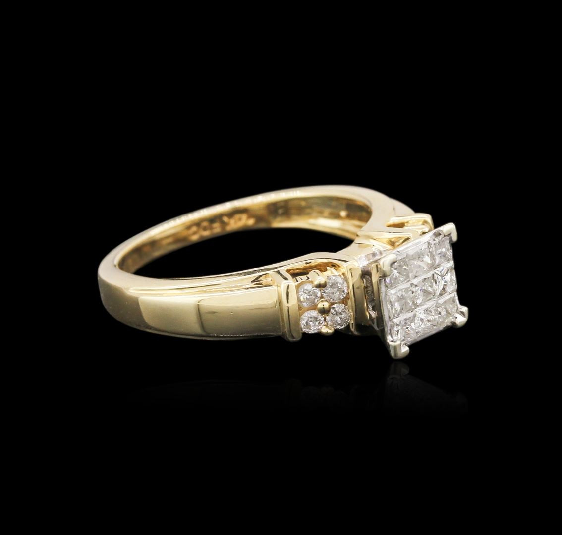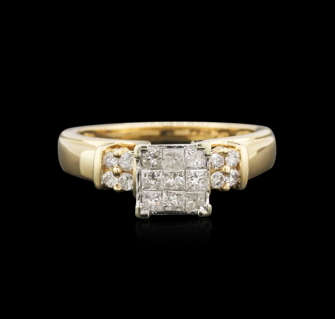 One electronically tested 14KT yellow gold ladies cast diamond ring with a bright polish finish. Identified with markings of "14K". Condition is very good. Containing: Nine invisible set princess cut diamonds, measuring 2.00 x 2.00 x 1.50mm (depth est.) approximate total weight of 9 Stones = 0.44ct. Clarity: I-1 to I-2. Color: I - J. Eight prong set round brilliant cut diamonds, measuring 1.60 - 1.60 x 0.96mm (depth est.) approximate total weight of 8 Stones = 0.12ct. Clarity: I-1 to I-2. Color: I - J. All diamonds are graded in the mounting, unless otherwise stated. Total Weight of Diamonds 0.56ct. Total Weight of Ring 5.20 grams. GGL Appraised at $1,395.00.