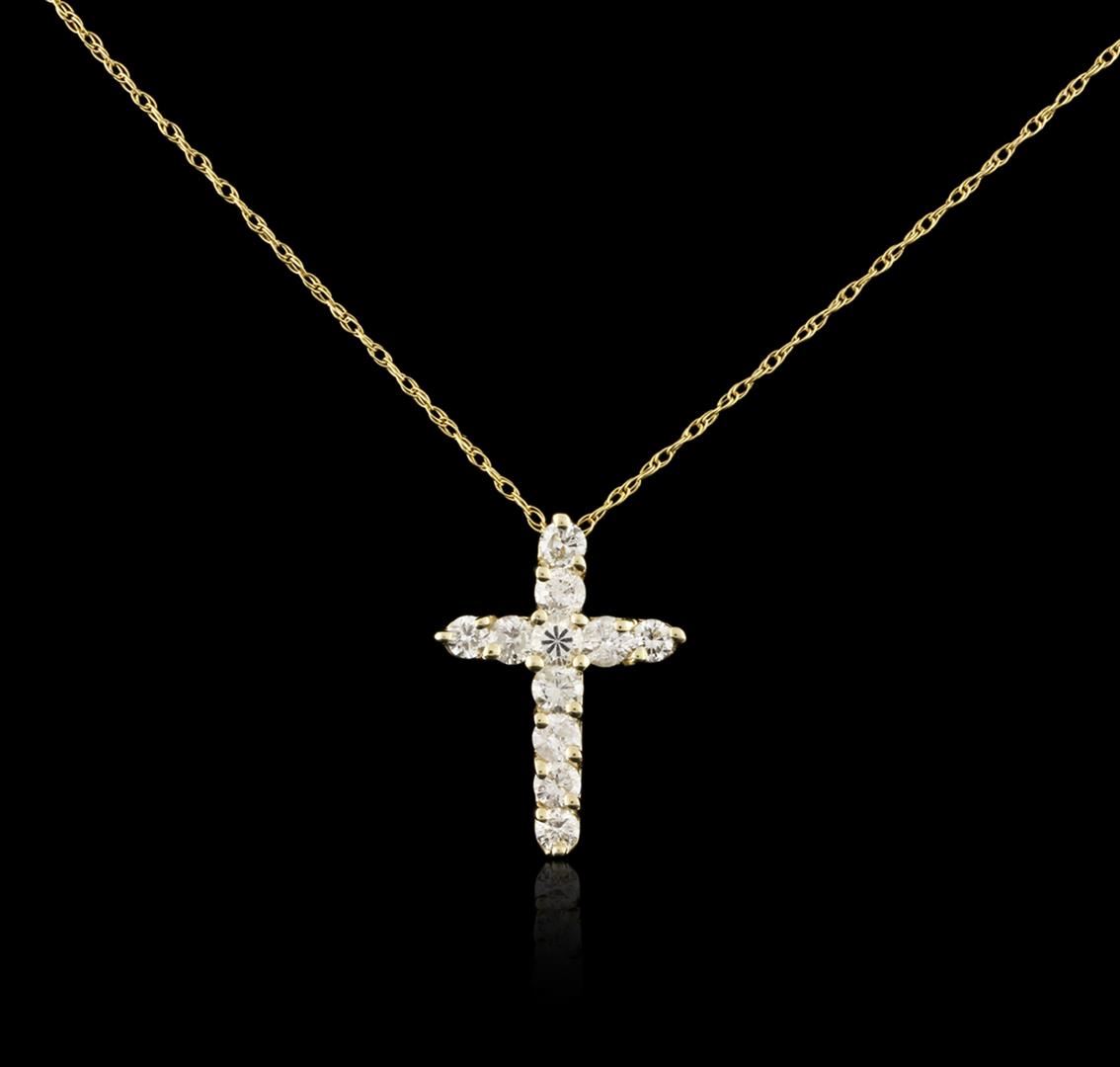 One cross pendant with chain featuring: 14KT yellow gold weighing 1.03 grams containing prong set round diamonds with a total weight of 0.59ct.