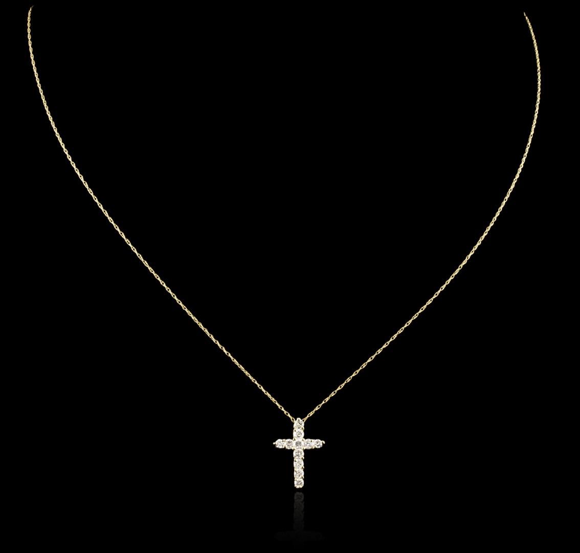 One cross pendant with chain featuring: 14KT yellow gold weighing 1.03 grams containing prong set round diamonds with a total weight of 0.59ct.