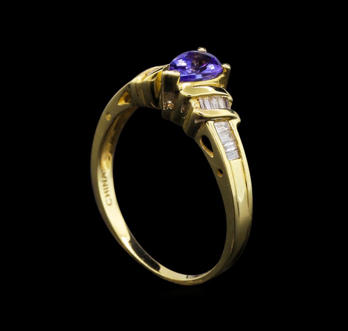 One electronically tested 14KT yellow gold ladies cast tanzanite and diamond ring with a bright polish finish. Identified with markings of "14K". Condition is new. Containing: One prong set pear modified brilliant cut natural tanzanite, measuring 7.00 x 4.50 x 2.93mm, approximate weight of 0.62ct., clarity is eye clean, type I, medium light, moderately strong, violet color, (GIA V 4/4), cut is good. Sixteen channel set baguette cut diamonds, measuring 1.50 x 1.10 x 0.94mm (depth est.) approximate total weight of 16 Stones = 0.23ct. Clarity: SI-2 to I-1. Color: I - J. Colored gemstones are presumed to have been subjected to commonly used enhancement processes. All diamonds and colored gemstones are graded in the mounting, unless otherwise stated. Total Weight of Colored Stones 0.62ct. Total Weight of Diamonds 0.23ct. Total Weight of Ring 3.20 grams. GGL Appraised at $1,745.00.