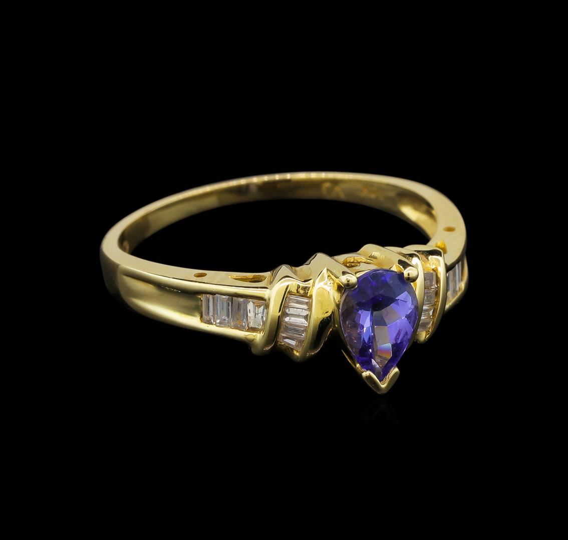 One electronically tested 14KT yellow gold ladies cast tanzanite and diamond ring with a bright polish finish. Identified with markings of "14K". Condition is new. Containing: One prong set pear modified brilliant cut natural tanzanite, measuring 7.00 x 4.50 x 2.93mm, approximate weight of 0.62ct., clarity is eye clean, type I, medium light, moderately strong, violet color, (GIA V 4/4), cut is good. Sixteen channel set baguette cut diamonds, measuring 1.50 x 1.10 x 0.94mm (depth est.) approximate total weight of 16 Stones = 0.23ct. Clarity: SI-2 to I-1. Color: I - J. Colored gemstones are presumed to have been subjected to commonly used enhancement processes. All diamonds and colored gemstones are graded in the mounting, unless otherwise stated. Total Weight of Colored Stones 0.62ct. Total Weight of Diamonds 0.23ct. Total Weight of Ring 3.20 grams. GGL Appraised at $1,745.00.