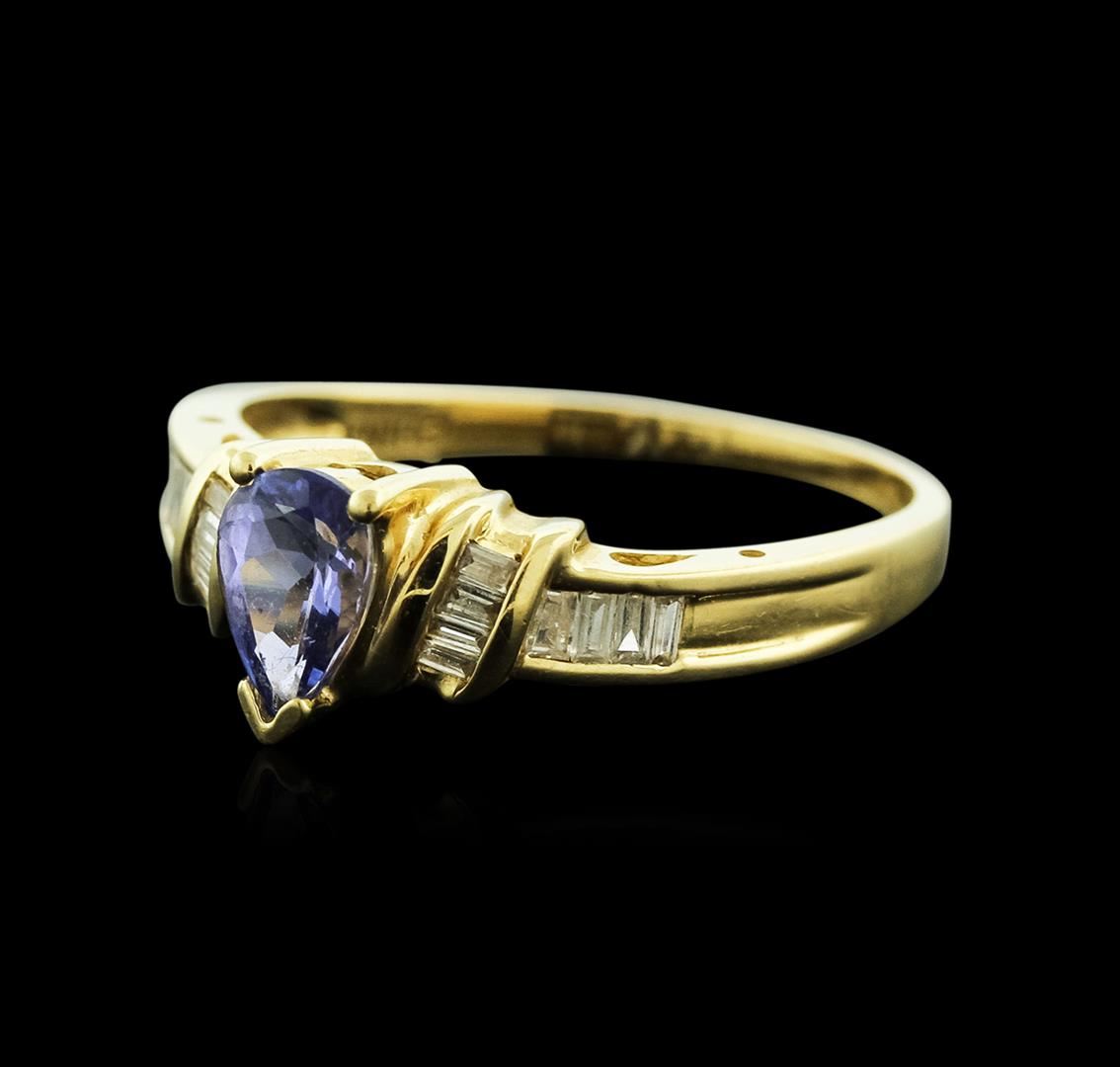 One electronically tested 14KT yellow gold ladies cast tanzanite and diamond ring with a bright polish finish. Identified with markings of "14K". Condition is new. Containing: One prong set pear modified brilliant cut natural tanzanite, measuring 7.00 x 4.50 x 2.93mm, approximate weight of 0.62ct., clarity is eye clean, type I, medium light, moderately strong, violet color, (GIA V 4/4), cut is good. Sixteen channel set baguette cut diamonds, measuring 1.50 x 1.10 x 0.94mm (depth est.) approximate total weight of 16 Stones = 0.23ct. Clarity: SI-2 to I-1. Color: I - J. Colored gemstones are presumed to have been subjected to commonly used enhancement processes. All diamonds and colored gemstones are graded in the mounting, unless otherwise stated. Total Weight of Colored Stones 0.62ct. Total Weight of Diamonds 0.23ct. Total Weight of Ring 3.20 grams. GGL Appraised at $1,745.00.