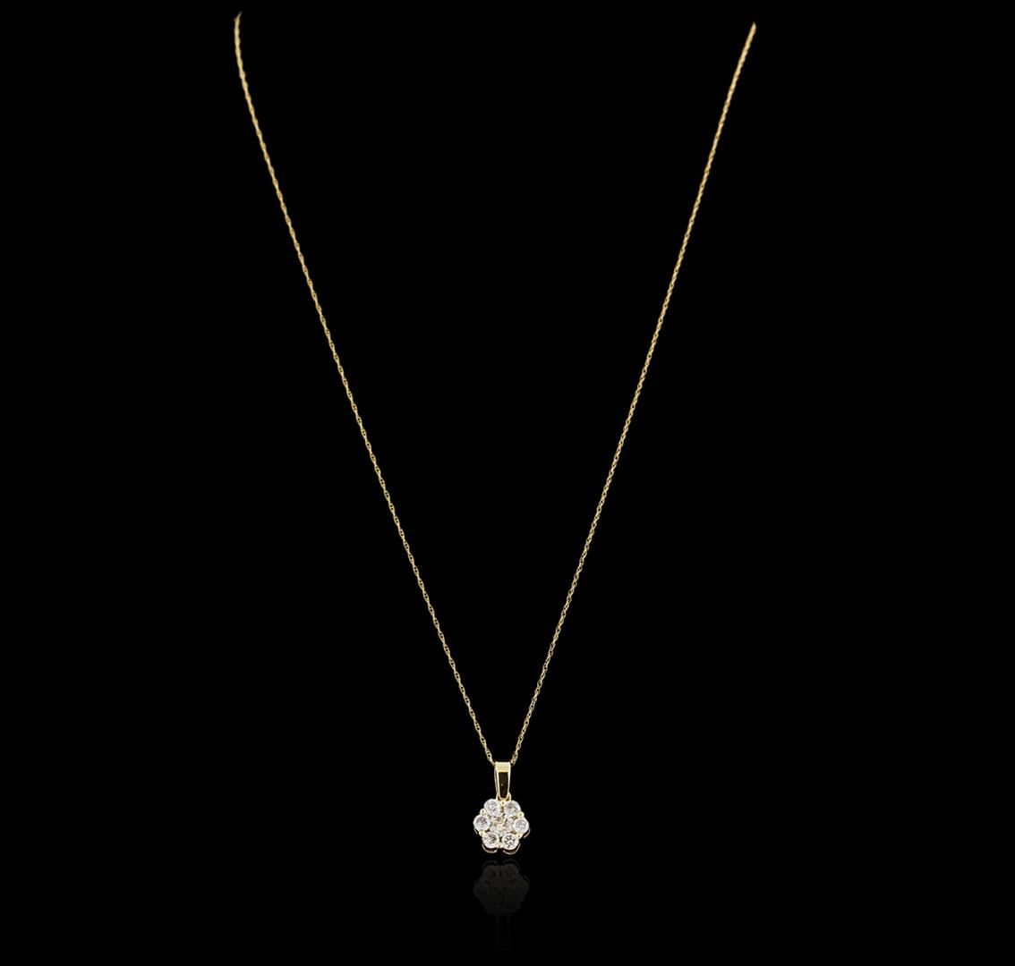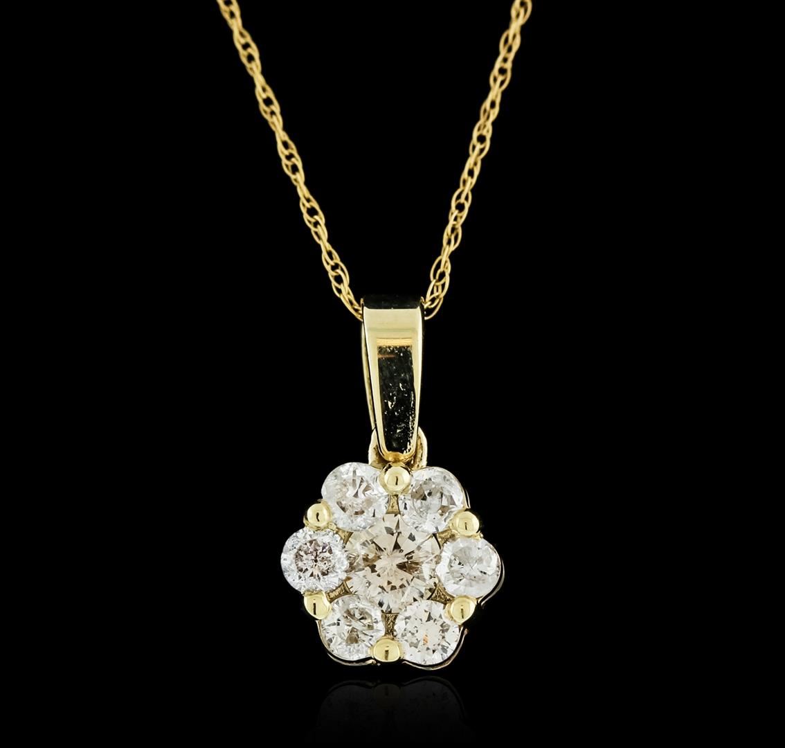 One pendant with chain featuring: 14KT yellow gold weighing 1.17 grams containing prong set round diamonds with a total weight of 0.63ct.
