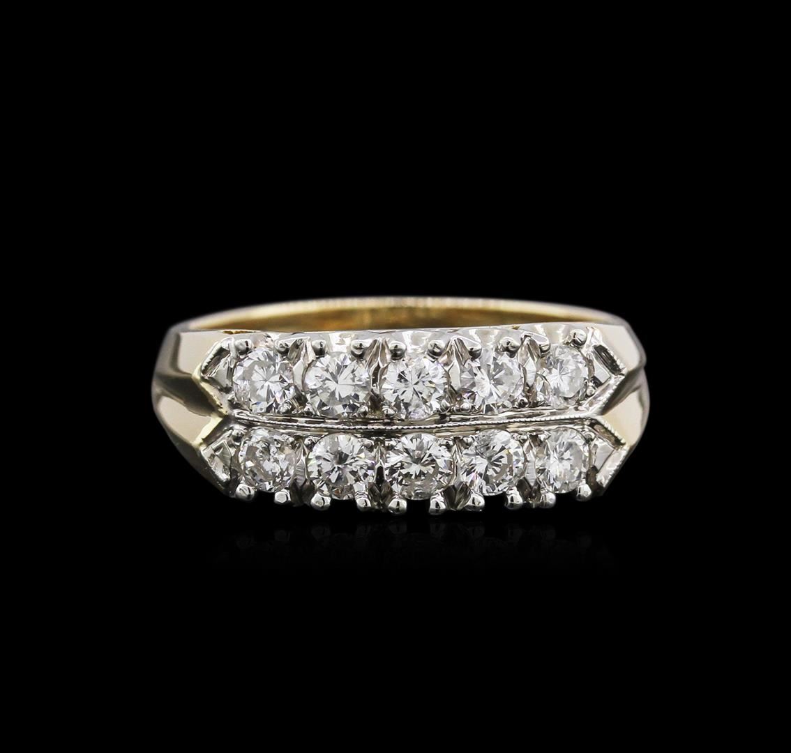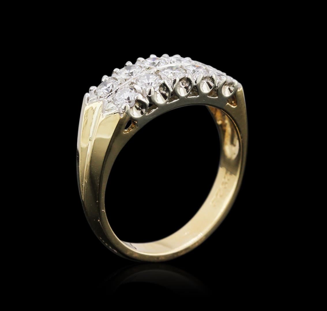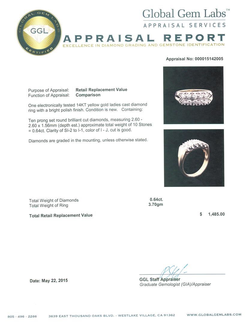 One electronically tested 14KT yellow gold ladies cast diamond ring with a bright polish finish. Condition is new. Containing: Ten prong set round brilliant cut diamonds, measuring 2.60 - 2.60 x 1.56mm (depth est.) approximate total weight of 10 Stones = 0.64ct. Clarity: SI-2 to I-1. Color: I - J, Cut is Good. Diamonds are graded in the mounting, unless otherwise stated. Total Weight of Diamonds 0.64ct. Total Weight of Ring 3.70 grams. GGL Appraised at $1,485.00.
