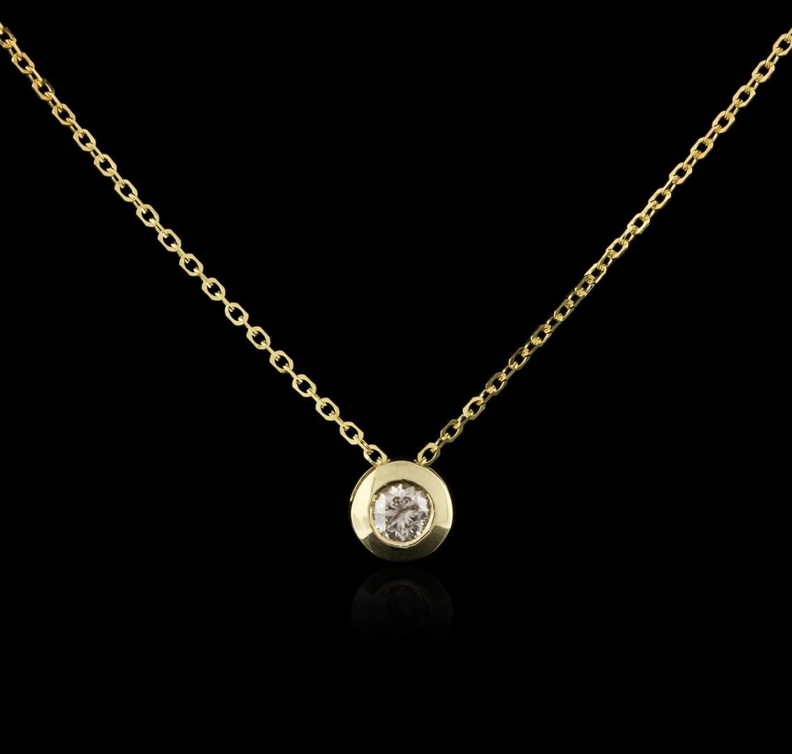 One pendant with chain featuring: 14KT yellow gold weighing 2.59 grams containing one bezel set round diamond with a total weight of 0.65ct.