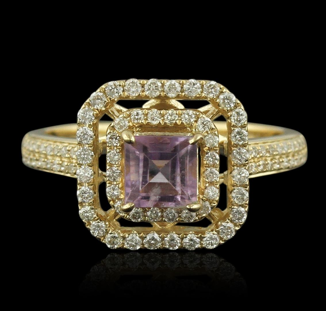 One electronically tested 14KT yellow gold Ladies combination cast & assembled ring with a bright polish finish. Condition is new. Identified with markings of "14K". Containing: Forty-Four prong set round brilliant cut diamonds, measuring 0.06 - 0.06 x 0.04mm (depth est.) approximate. Total Weight of 44 Stones = 0.20ct. Clarity: I-1 to I-2. Color: I - J, Cut is Good. Twenty-Eight prong set round brilliant cut diamonds, measuring 1.10 - 1.10 x 0.66mm (depth est.) approximate. Total Weight of 28 Stones = 0.27ct. Clarity: I-1 to I-2. Color: I - J, Cut is Good. Twenty prong set round brilliant cut diamonds, measuring 0.90 - 0.90 x 0.54mm (depth est.) approximate. Total Weight of 20 Stones = 0.05ct. Clarity: I-1 to I-2. Color: I - J, Cut is Good. One prong set square standard step cut natural amethyst, measuring 5.00 x 5.00 x 3.25mm, approximate weight of 0.67ct., clarity is eye clean, type II, light, very slightly grayish, purple color, (GIA P 3/3), cut is very good. Colored gemstones are presumed to have been subjected to commonly used color/clarity enhancement processes. Total Weight of Colored Stones 0.67ct. Total Weight of Diamonds 0.52ct. Total Weight of Ring 3.60 grams. GGL Appraised at $2,805.00.