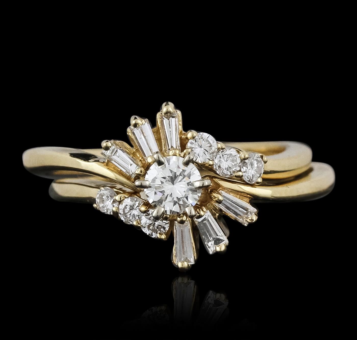 One electronically tested 14KT yellow gold ladies cast & assembled diamond wedding set. The wedding set includes a diamond engagement ring and a diamond wedding band. The engagement ring features a diamond set within a series of round and baguette diamonds. The set is completed by a matching diamond wedding band. Each ring is completed by a one and one-half millimeter wide band. Identified with markings of "14K". Condition is new, good workmanship. Containing: One prong set round brilliant cut diamond, measuring 3.85 - 3.80 x 2.30mm (depth est.) approximate weight of 0.30ct with a medium blue fluorescence. Graded in the setting. Clarity: SI-1. Color: J. Depth 60.1%. Table 70.5%. Six prong set round brilliant cut diamonds, measuring 2.10 - 2.00 x 1.23mm (depth est.) approximate total weight of 6 Stones = 0.25ct. Graded in the setting. Clarity: SI-1 to SI-2. Color: G - I Six prong set baguette cut (tapered) diamonds, measuring from 2.90 x 1.00 x 0.70mm (depth est.) to 3.20 x 1.20 x 0.84mm (depth est.) approximate total weight of 6 Stones = 0.14ct. Graded in the setting. Clarity: VVS-2 to VS-2. Color: G - I. Total Weight of Diamonds 0.69ct. Total Weight of Wedding Set 4.72 grams. AIG Appraised at $4,440.00.