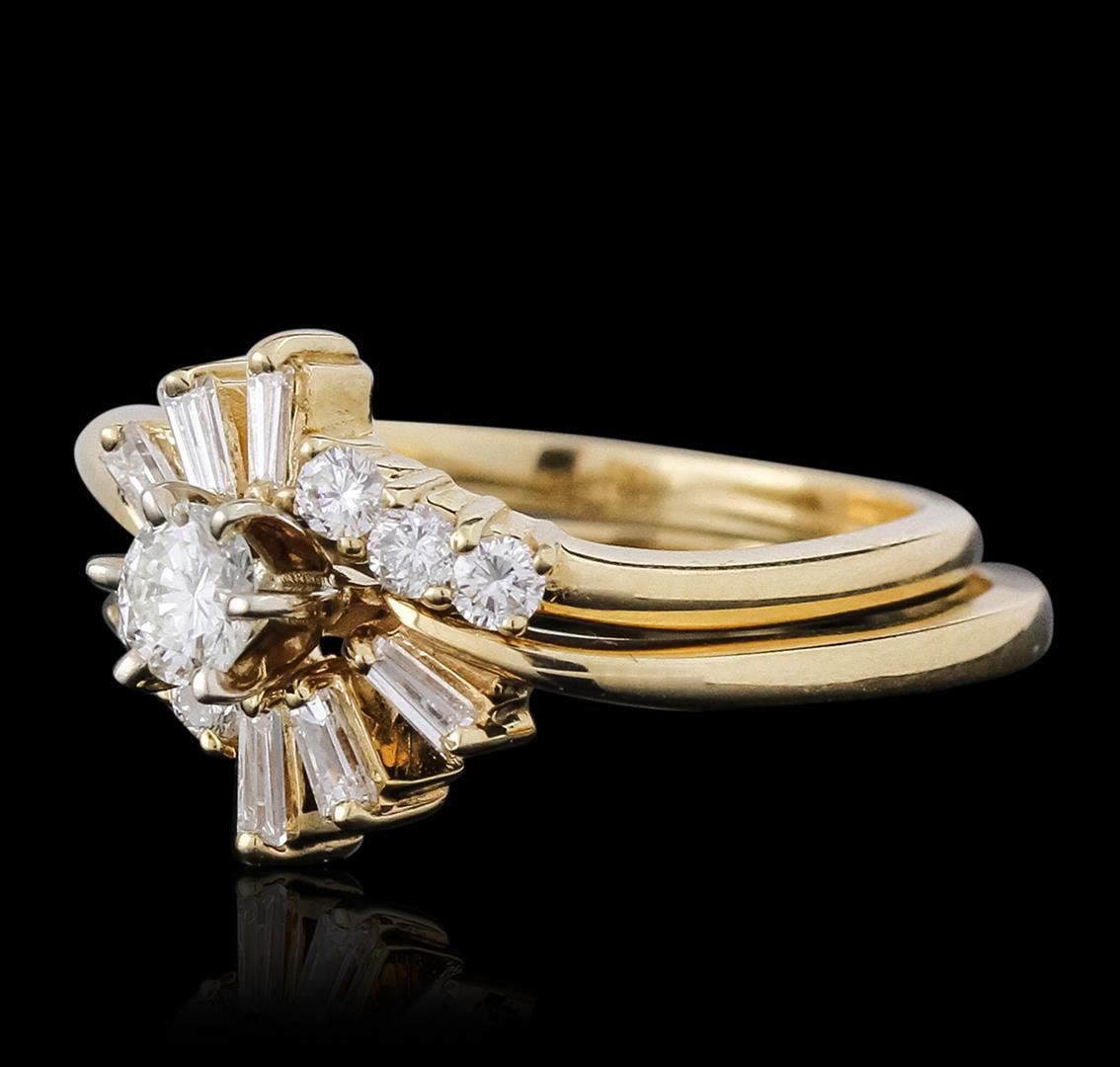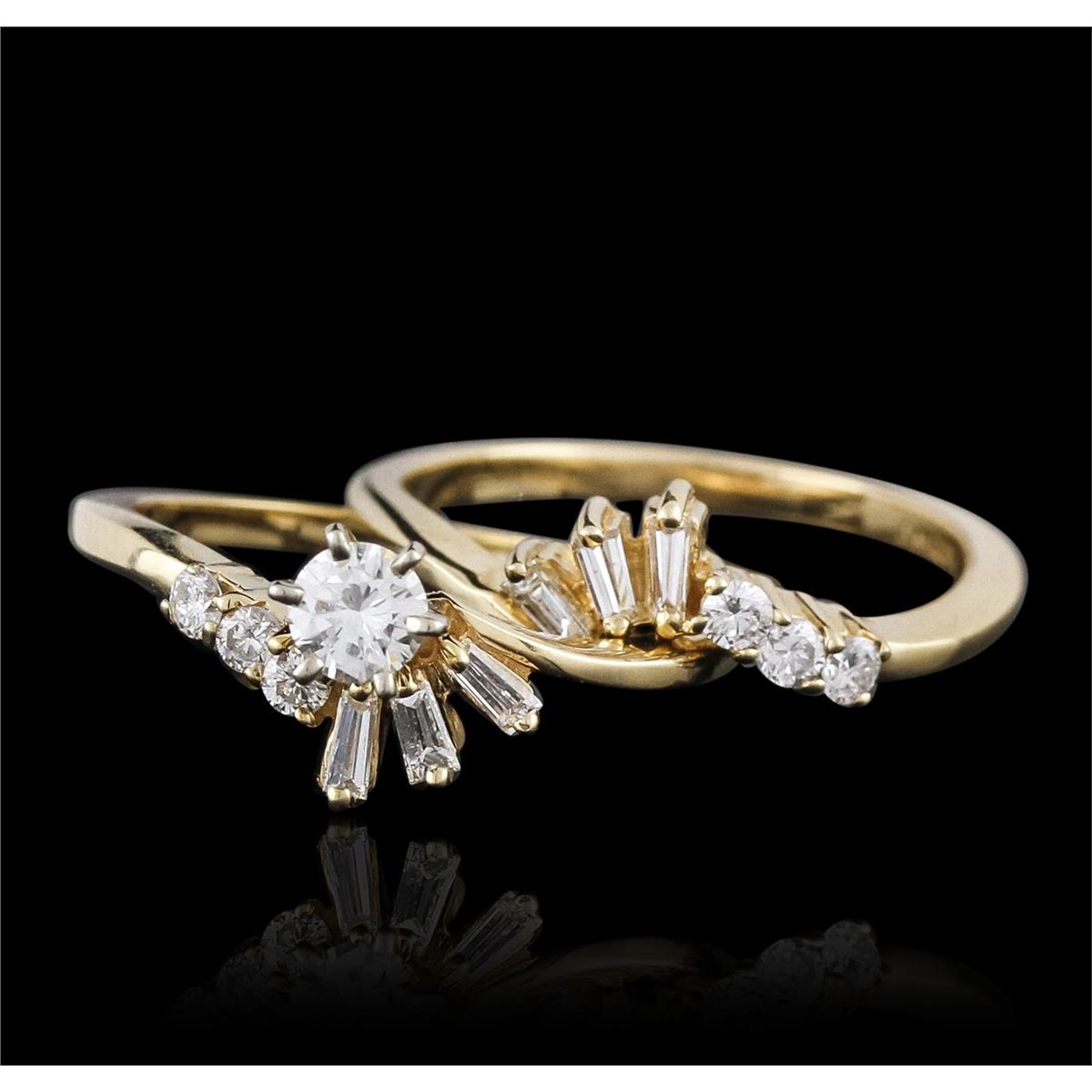 One electronically tested 14KT yellow gold ladies cast & assembled diamond wedding set. The wedding set includes a diamond engagement ring and a diamond wedding band. The engagement ring features a diamond set within a series of round and baguette diamonds. The set is completed by a matching diamond wedding band. Each ring is completed by a one and one-half millimeter wide band. Identified with markings of "14K". Condition is new, good workmanship. Containing: One prong set round brilliant cut diamond, measuring 3.85 - 3.80 x 2.30mm (depth est.) approximate weight of 0.30ct with a medium blue fluorescence. Graded in the setting. Clarity: SI-1. Color: J. Depth 60.1%. Table 70.5%. Six prong set round brilliant cut diamonds, measuring 2.10 - 2.00 x 1.23mm (depth est.) approximate total weight of 6 Stones = 0.25ct. Graded in the setting. Clarity: SI-1 to SI-2. Color: G - I Six prong set baguette cut (tapered) diamonds, measuring from 2.90 x 1.00 x 0.70mm (depth est.) to 3.20 x 1.20 x 0.84mm (depth est.) approximate total weight of 6 Stones = 0.14ct. Graded in the setting. Clarity: VVS-2 to VS-2. Color: G - I. Total Weight of Diamonds 0.69ct. Total Weight of Wedding Set 4.72 grams. AIG Appraised at $4,440.00.