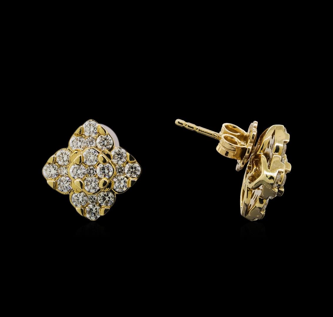 One pair electronically tested 14KT yellow gold ladies cast diamond stud earrings with friction posts with a bright polish finish. Identified with markings of "585". Condition is new. Containing: Thirty-Four prong set round brilliant cut diamonds, measuring 2.10 - 1.30 x 1.02mm (depth est.) approximate total weight of 34 Stones = 0.70ct. Clarity: SI-1 to I-1. Color: I - J, Cut is Good. Diamonds are graded in the mounting, unless otherwise stated. Total Weight of Diamonds 0.70ct. Total Weight of Earrings 5.70 grams. GGL Appraised at $1,995.00.