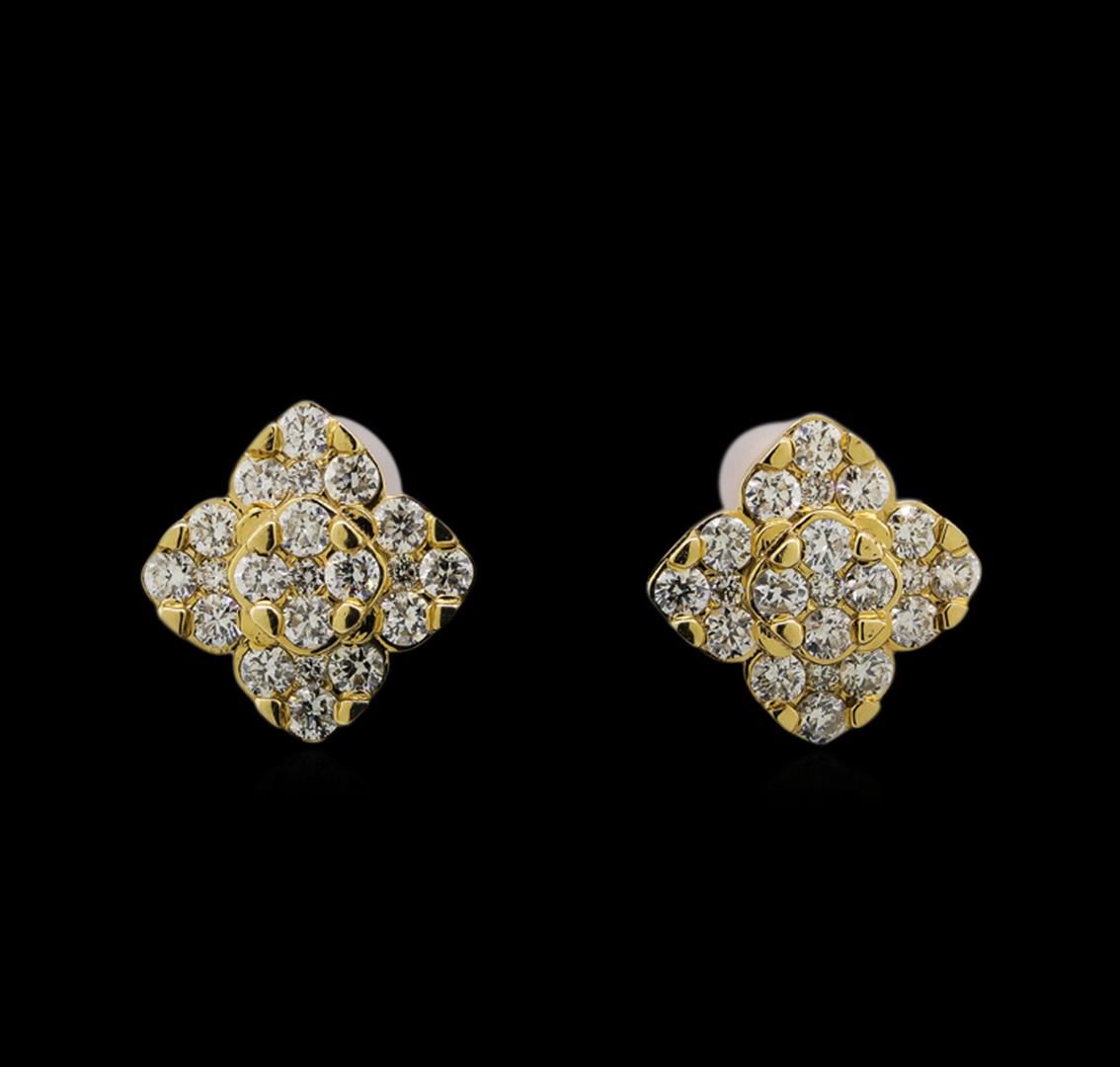 One pair electronically tested 14KT yellow gold ladies cast diamond stud earrings with friction posts with a bright polish finish. Identified with markings of "585". Condition is new. Containing: Thirty-Four prong set round brilliant cut diamonds, measuring 2.10 - 1.30 x 1.02mm (depth est.) approximate total weight of 34 Stones = 0.70ct. Clarity: SI-1 to I-1. Color: I - J, Cut is Good. Diamonds are graded in the mounting, unless otherwise stated. Total Weight of Diamonds 0.70ct. Total Weight of Earrings 5.70 grams. GGL Appraised at $1,995.00.
