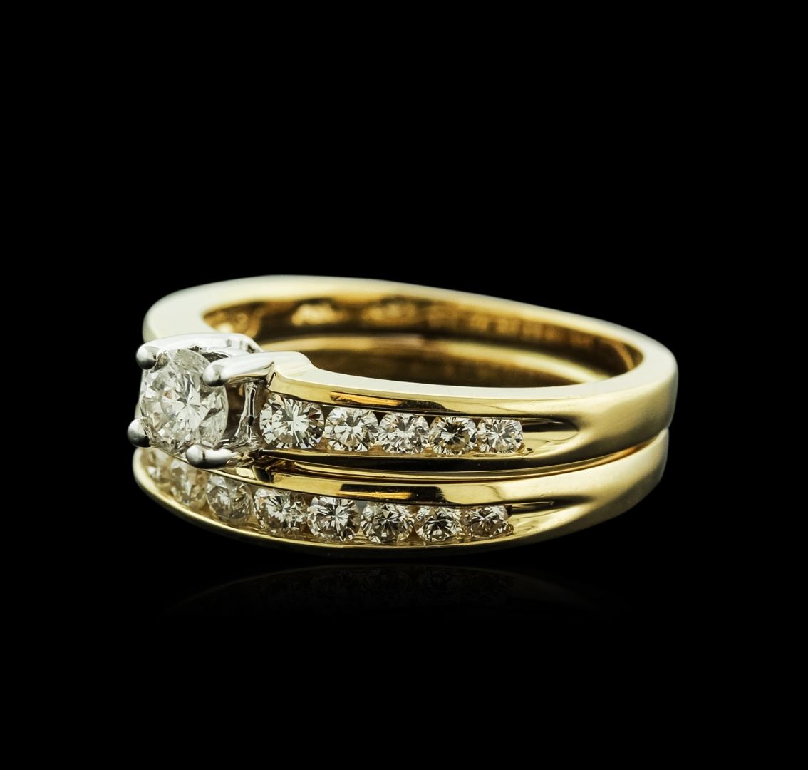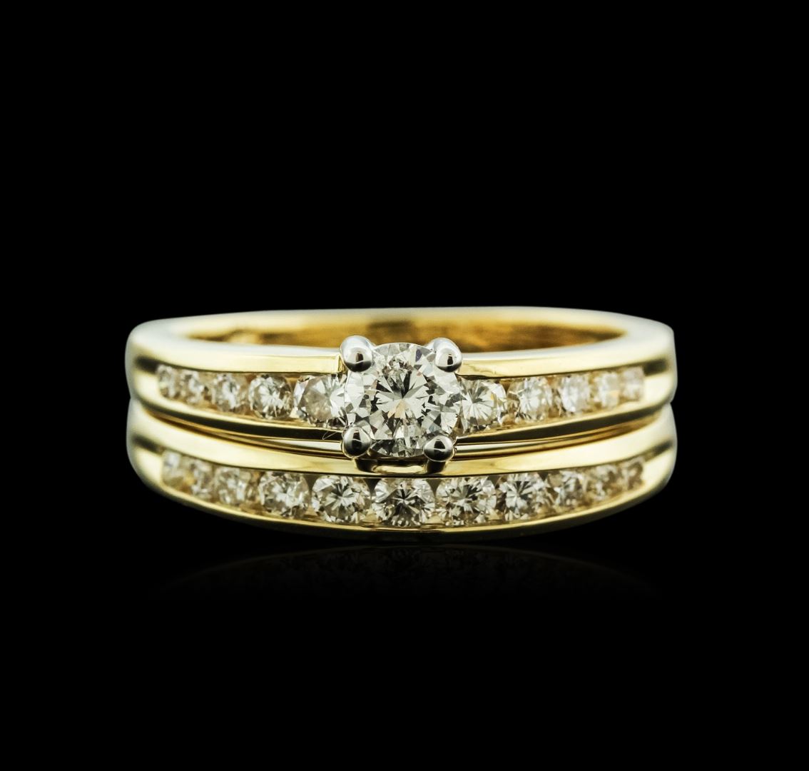 One wedding ring set featuring: 14KT yellow gold weighing 5.70 grams containing one center diamond with a total weight of 0.25ct and diamonds with a total weight of 0.45ct.
