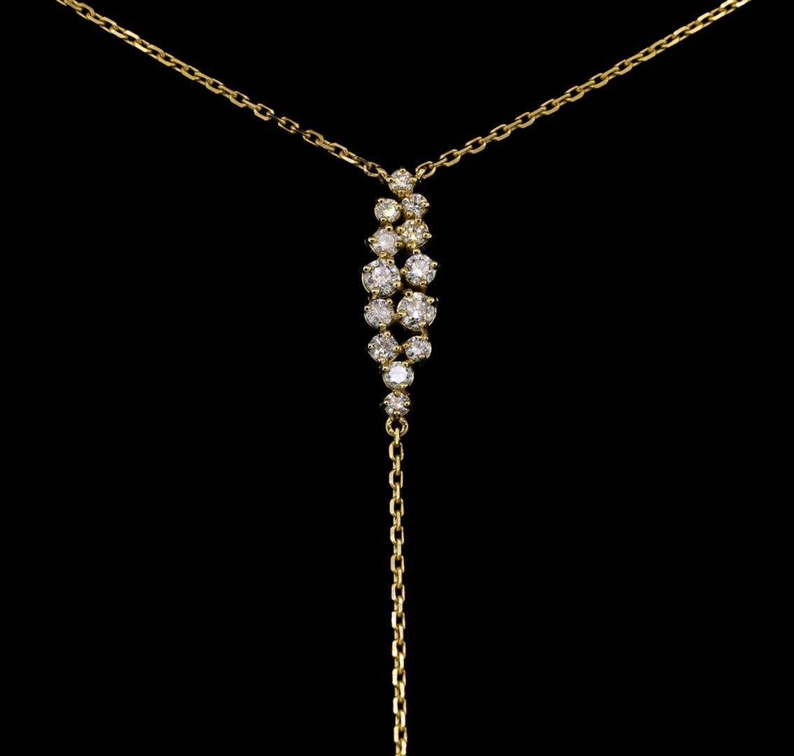 One electronically tested 14KT yellow gold ladies cast diamond necklace with a lobster claw clasp with a bright polish finish. Identified with markings of "14K". Condition is new. Containing: Two prong set round brilliant cut diamonds, measuring 3.00 - 3.00 x 1.80mm (depth est.) approximate total weight of 2 Stones = 0.19ct. Clarity: I-1. Color: H - I, Cut is Good. Thirteen prong set round brilliant cut diamonds, measuring 2.50 - 1.50 x 1.20mm (depth est.) approximate total weight of 13 Stones = 0.52ct. Clarity: SI-1 to I-1. Color: H - I, Cut is Good. All diamonds are graded in the mounting, unless otherwise stated. Total Weight of Diamonds 0.71ct. Total Weight of Necklace 4.40 grams. GGL Appraised at $2,230.00.