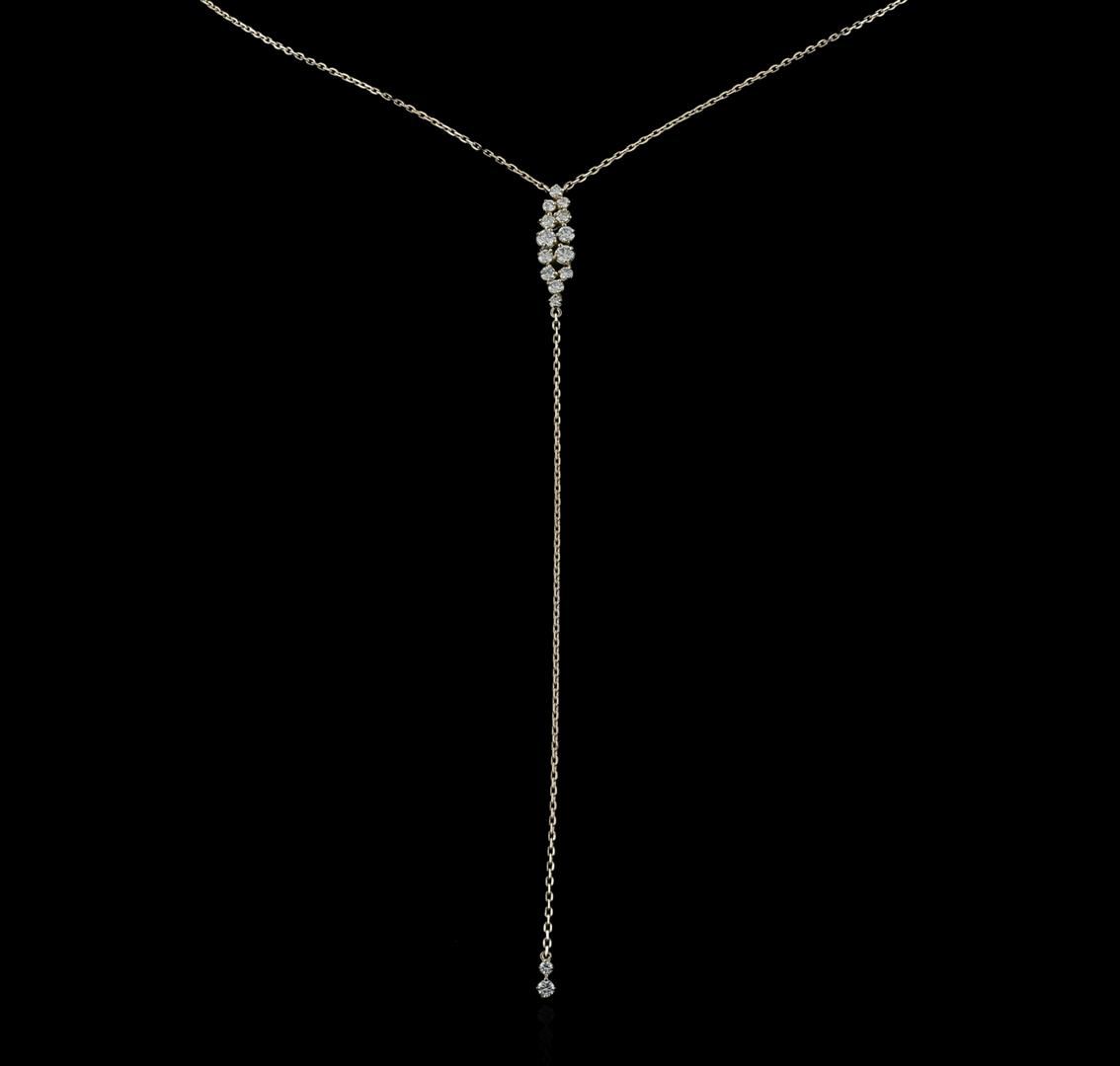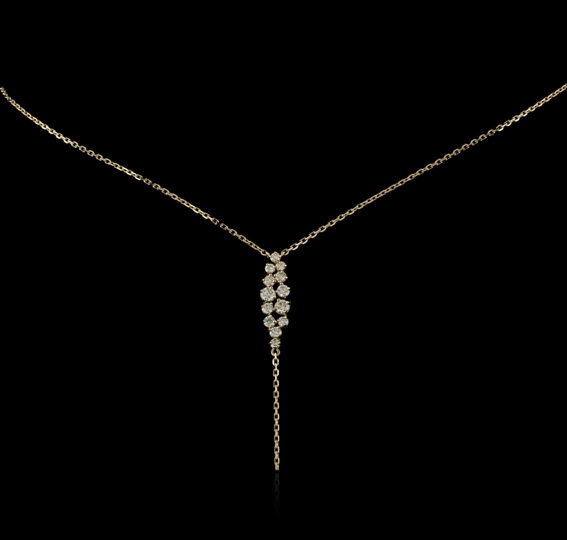 One electronically tested 14KT yellow gold ladies cast diamond necklace with a lobster claw clasp with a bright polish finish. Identified with markings of "14K". Condition is new. Containing: Two prong set round brilliant cut diamonds, measuring 3.00 - 3.00 x 1.80mm (depth est.) approximate total weight of 2 Stones = 0.19ct. Clarity: I-1. Color: H - I, Cut is Good. Thirteen prong set round brilliant cut diamonds, measuring 2.50 - 1.50 x 1.20mm (depth est.) approximate total weight of 13 Stones = 0.52ct. Clarity: SI-1 to I-1. Color: H - I, Cut is Good. All diamonds are graded in the mounting, unless otherwise stated. Total Weight of Diamonds 0.71ct. Total Weight of Necklace 4.40 grams. GGL Appraised at $2,230.00.