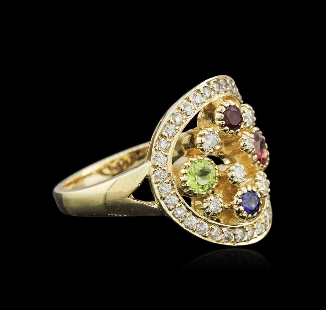 One electronically tested 14KT yellow gold ladies cast multi gemstone and diamond ring with a bright polish finish. The ring features an organized multi gemstone and diamond cluster set within a diamond bezel, completed by a two millimeter wide band. Identified with markings of "K14". Condition is new, good workmanship. Containing: One bezel set round brilliant cut natural almandite garnet, measuring 4.20 - 4.10 x 2.40 mm, approximate weight of 0.34ct., clarity is slightly included, type II, dark, very slightly brownish, strongly purplish red color, (GIA stpR 7/3), cut is good. Transmitting light with a minimum of distortion, transparent. Naturally occurring internal & external characteristics are present. Graded in the setting. One bezel set round brilliant cut natural peridot, measuring 3.60 - 3.50 x 2.25 mm, approximate weight of 0.19ct., clarity is eye clean, type II, medium dark, moderately strong, yellowish green color, (GIA yG 6/4), cut is good. Transmitting light with no distortion, transparent. Graded in the setting. Two bezel set round brilliant cut natural sapphire and rubies, measuring 2.80 - 2.70 x 1.79 mm, approximate total weight of 0.22ct., clarity is slightly included, cut is good. Transmitting light with a minimum of distortion, transparent. Naturally occurring internal & external characteristics are present. Graded in the setting. Forty prong and channel set round brilliant cut diamonds, measuring 1.80 - 1.60 x 1.02mm (depth est.) approximate total weight of 40 Stones = 0.81ct. Graded in the setting. Clarity: SI-1 to I-1. Color: G - I. Total Weight of Colored Stones 0.75ct. Total Weight of Diamonds 0.81ct. Total Weight of Ring 6.88 grams. AIG Appraised at $3,510.00.