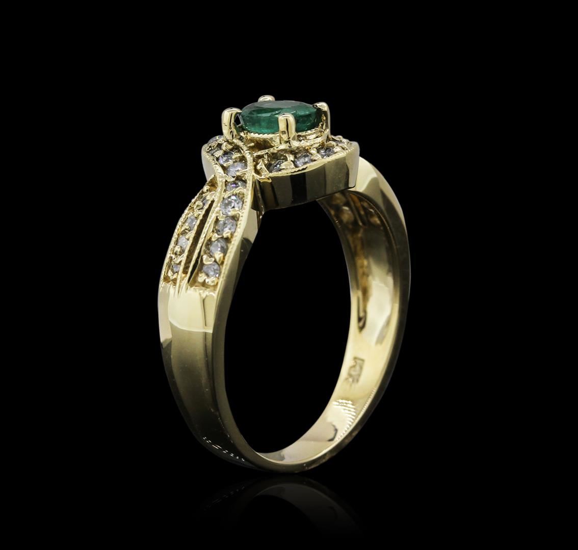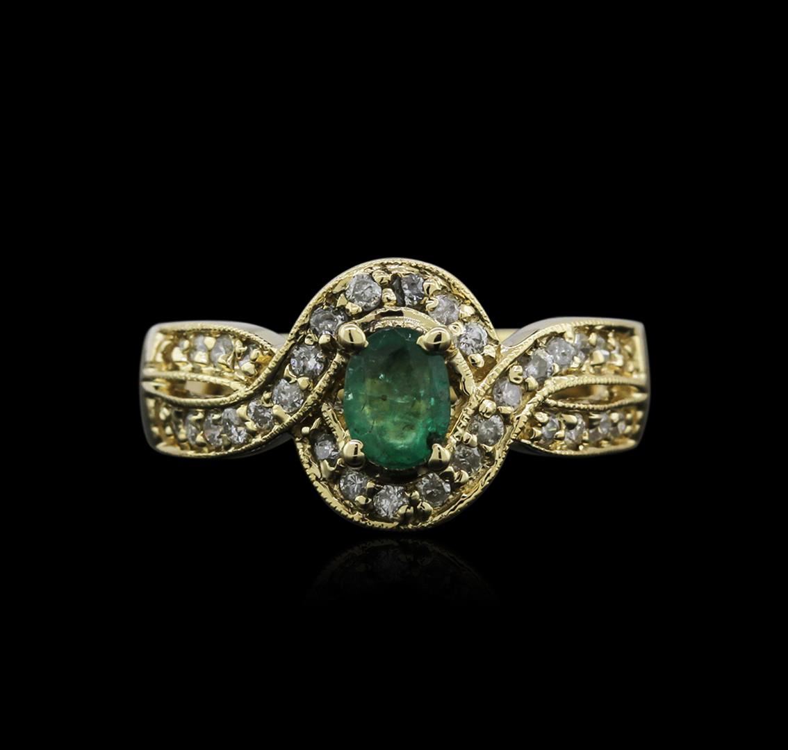 One ring featuring: 14KT yellow gold weighing 4.11 grams containing one emerald center stone with a total weight of 0.82ct and 32 diamonds with a total weight of 0.34ct.