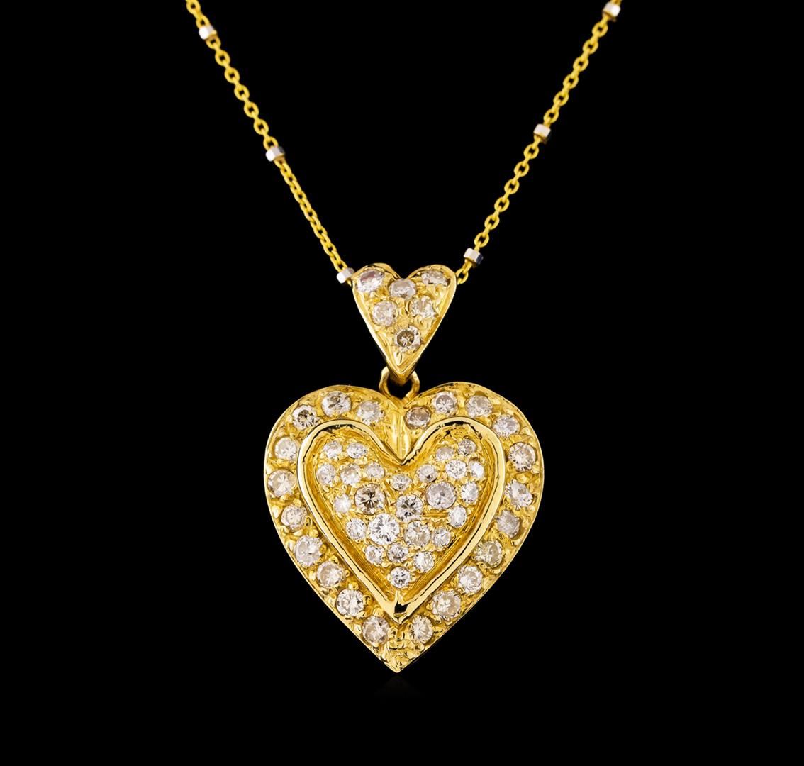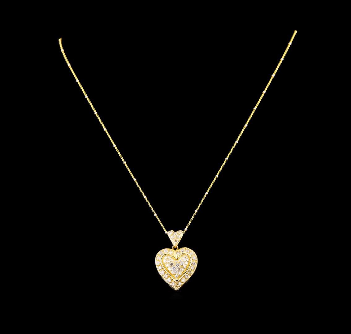 One electronically tested 14KT yellow gold ladies combination cast & assembled diamond pendant & chain 18.3" long, cable link with a spring ring clasp with a bright polish finish. Condition is new. Containing: Fifty-Two prong set round brilliant cut diamonds, measuring 2.00 - 1.30 x 0.99mm (depth est.) approximate total weight of 52 Stones = 0.85ct. Clarity: SI-1 to I-1. Color: J - K, Cut is Good. All diamonds are graded in the mounting, unless otherwise stated. Total Weight of Diamonds 0.85ct. Total Weight of Pendant & Chain 9.50 grams. GGL Appraised at $4,775.00.