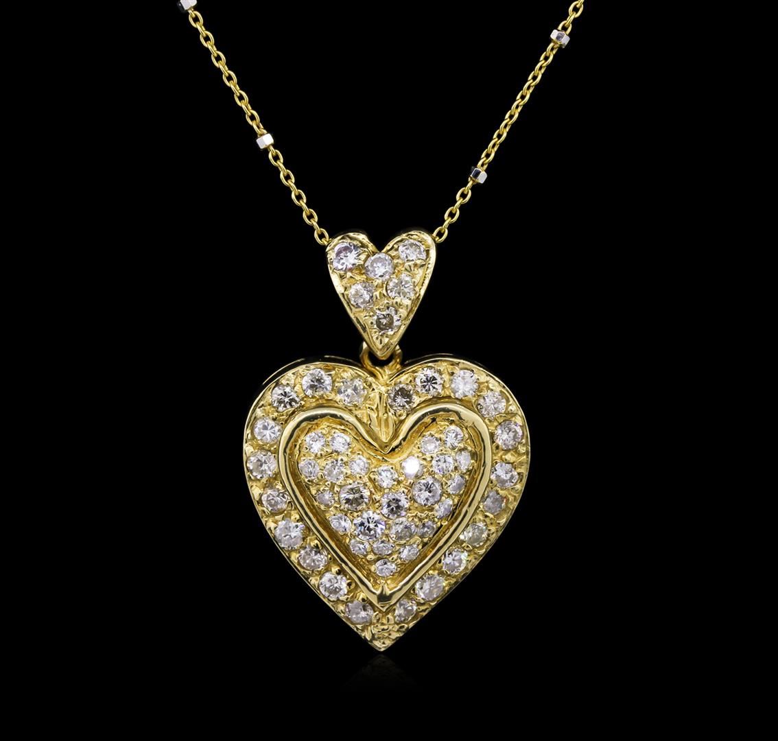 One electronically tested 14KT yellow gold ladies combination cast & assembled diamond pendant & chain 18.3" long, cable link with a spring ring clasp with a bright polish finish. Condition is new. Containing: Fifty-Two prong set round brilliant cut diamonds, measuring 2.00 - 1.30 x 0.99mm (depth est.) approximate total weight of 52 Stones = 0.85ct. Clarity: SI-1 to I-1. Color: J - K, Cut is Good. All diamonds are graded in the mounting, unless otherwise stated. Total Weight of Diamonds 0.85ct. Total Weight of Pendant & Chain 9.50 grams. GGL Appraised at $4,775.00.