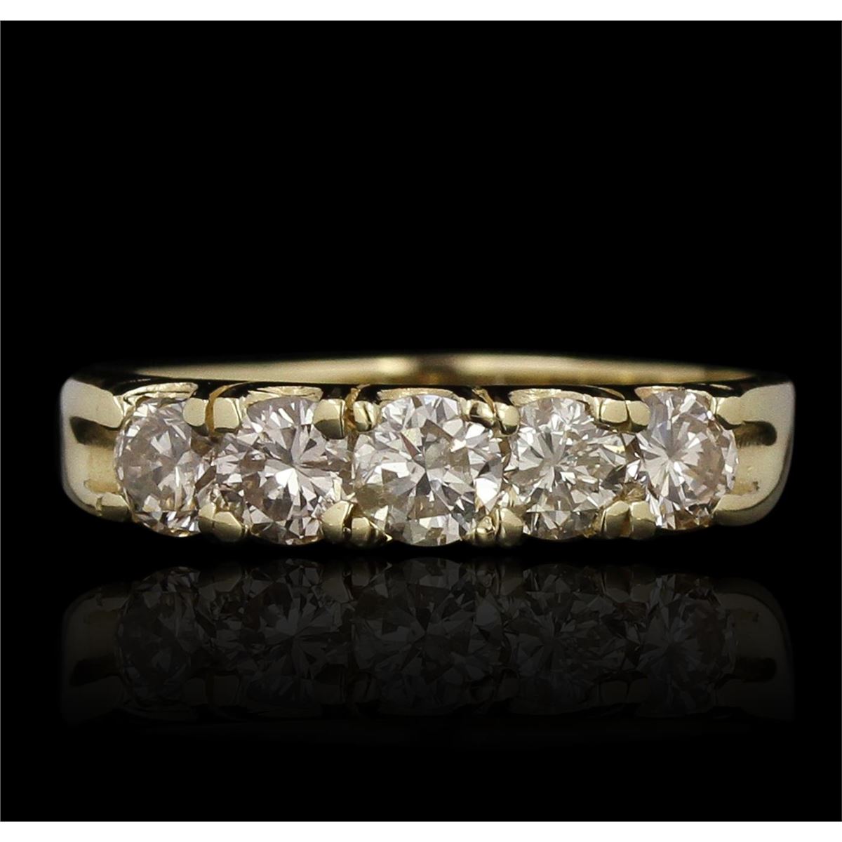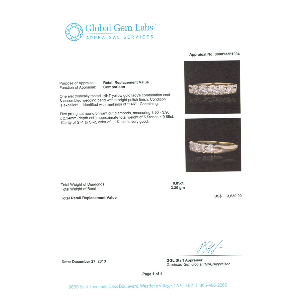 One electronically tested 14KT yellow gold Ladies combination cast & assembled wedding band with a bright polish finish. Identified with markings of "14K". Condition is excellent. Containing: Five prong set round brilliant cut diamonds, measuring 3.90 - 3.90 x 2.34mm (depth est.) approximate total weight of 5 Stones = 0.85ct. Clarity of SI-1 to SI-2, Color of J - K, Cut is Very Good. Total Weight of Diamonds 0.85ct. Total Weight of Band 3.30gm. GGL Appraised at $3,630.00.