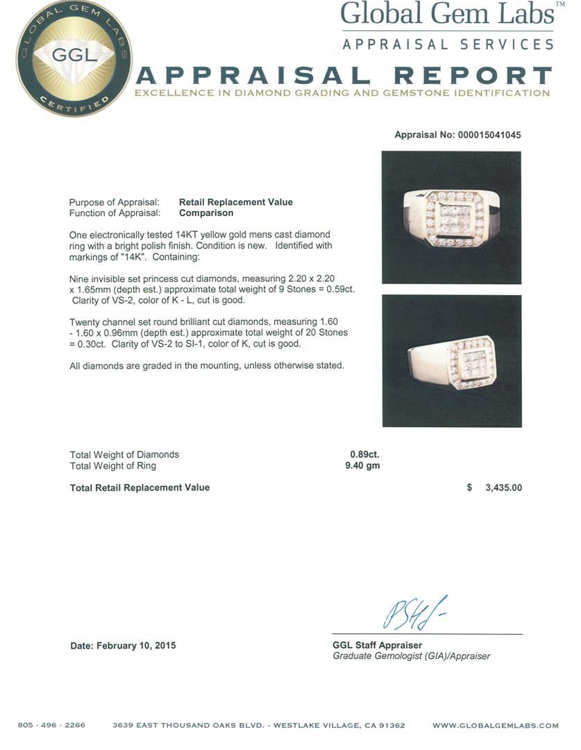 One electronically tested 14KT yellow gold mens cast diamond ring with a bright polish finish. Identified with markings of "14K". Condition is new. Containing: Nine invisible set princess cut diamonds, measuring 2.20 x 2.20 x 1.65mm (depth est.) approximate total weight of 9 Stones = 0.59ct. Clarity: VS-2. Color: K - L, Cut is Good. Twenty channel set round brilliant cut diamonds, measuring 1.60 - 1.60 x 0.96mm (depth est.) approximate total weight of 20 Stones = 0.30ct. Clarity: VS-2 to SI-1. Color: K, Cut is Good. All diamonds are graded in the mounting, unless otherwise stated. Total Weight of Diamonds 0.89ct. Total Weight of Ring 9.40 grams. GGL Appraised at $3,435.00.