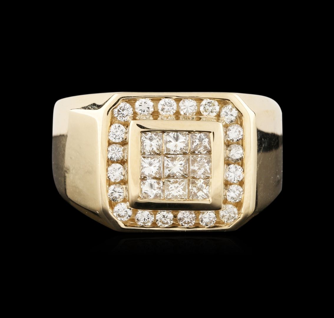 One electronically tested 14KT yellow gold mens cast diamond ring with a bright polish finish. Identified with markings of "14K". Condition is new. Containing: Nine invisible set princess cut diamonds, measuring 2.20 x 2.20 x 1.65mm (depth est.) approximate total weight of 9 Stones = 0.59ct. Clarity: VS-2. Color: K - L, Cut is Good. Twenty channel set round brilliant cut diamonds, measuring 1.60 - 1.60 x 0.96mm (depth est.) approximate total weight of 20 Stones = 0.30ct. Clarity: VS-2 to SI-1. Color: K, Cut is Good. All diamonds are graded in the mounting, unless otherwise stated. Total Weight of Diamonds 0.89ct. Total Weight of Ring 9.40 grams. GGL Appraised at $3,435.00.
