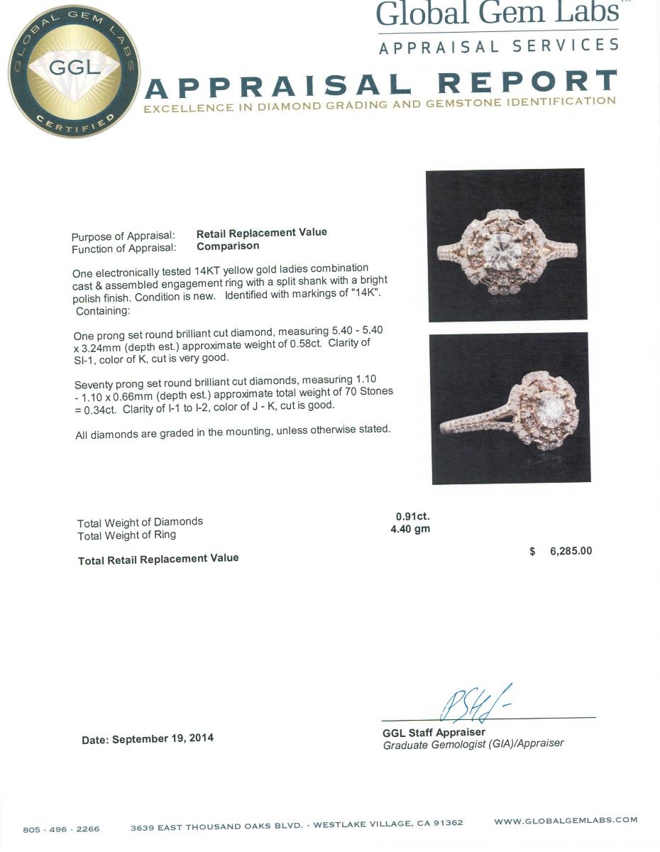 One electronically tested 14KT yellow gold ladies combination cast & assembled engagement ring with a split shank with a bright polish finish. Identified with markings of "14K". Condition is new. Containing: One prong set round brilliant cut diamond, measuring 5.40 - 5.40 x 3.24mm (depth est.) approximate weight of 0.58ct. Clarity: SI-1. Color: K, Cut is Very Good. Seventy prong set round brilliant cut diamonds, measuring 1.10 - 1.10 x 0.66mm (depth est.) approximate total weight of 70 Stones = 0.34ct. Clarity: I-1 to I-2. Color: J - K, Cut is Good. All diamonds are graded in the mounting, unless otherwise stated. Total Weight of Diamonds 0.91ct. Total Weight of Ring 4.40 grams. GGL Appraised at $6,285.00.
