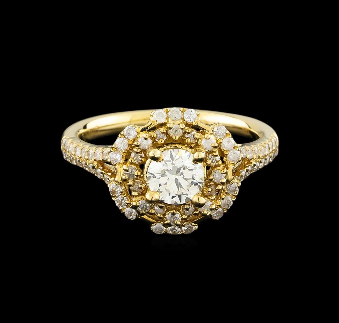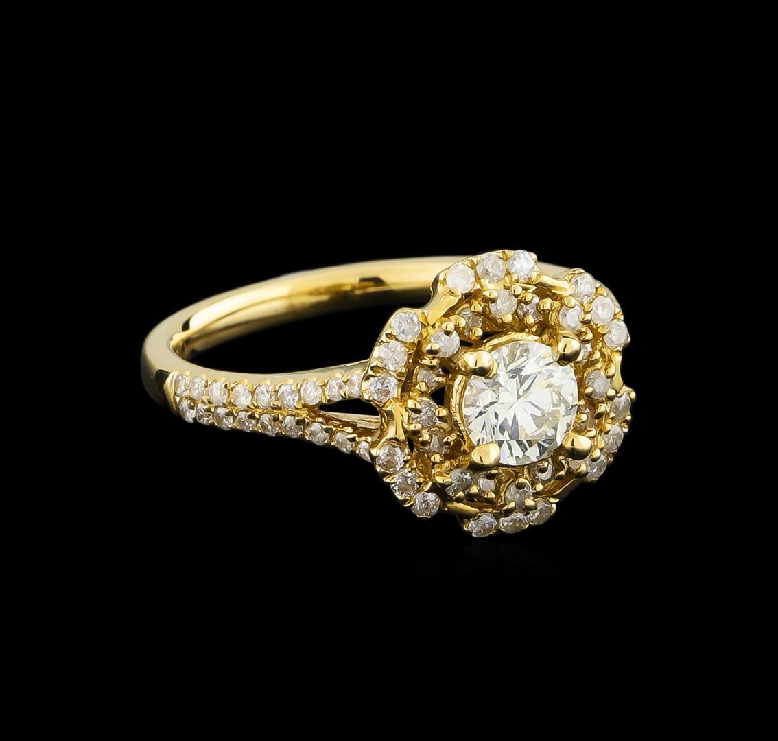 One electronically tested 14KT yellow gold ladies combination cast & assembled engagement ring with a split shank with a bright polish finish. Identified with markings of "14K". Condition is new. Containing: One prong set round brilliant cut diamond, measuring 5.40 - 5.40 x 3.24mm (depth est.) approximate weight of 0.58ct. Clarity: SI-1. Color: K, Cut is Very Good. Seventy prong set round brilliant cut diamonds, measuring 1.10 - 1.10 x 0.66mm (depth est.) approximate total weight of 70 Stones = 0.34ct. Clarity: I-1 to I-2. Color: J - K, Cut is Good. All diamonds are graded in the mounting, unless otherwise stated. Total Weight of Diamonds 0.91ct. Total Weight of Ring 4.40 grams. GGL Appraised at $6,285.00.